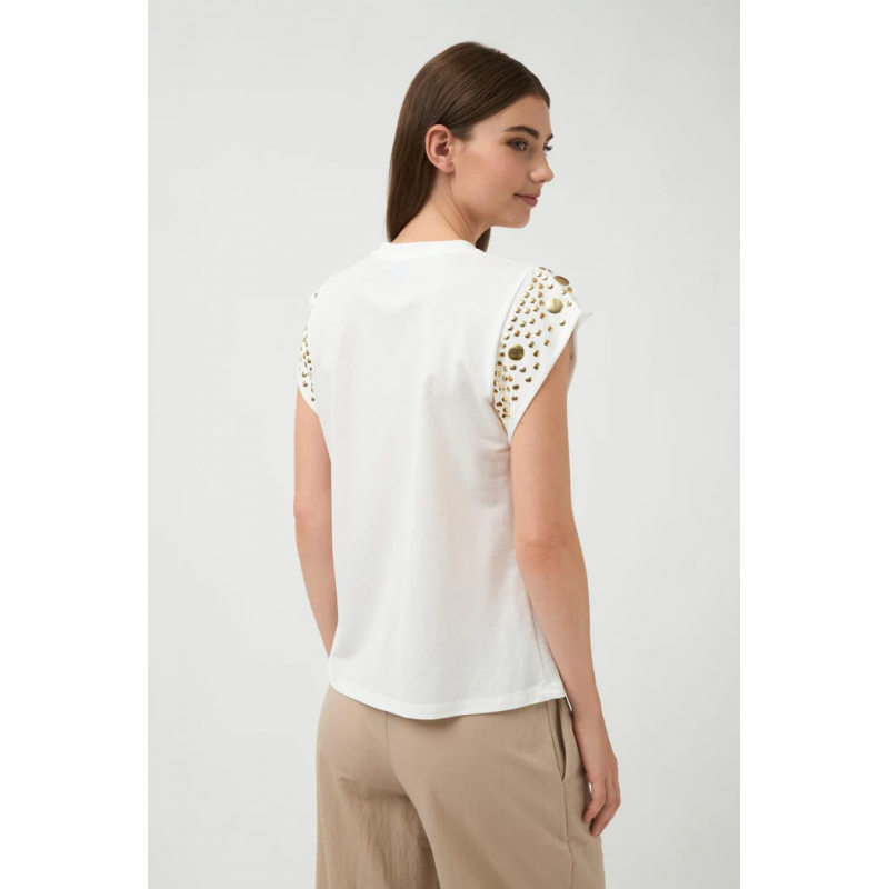 Camiseta de manga corta lisa para mujer.Tejido ligero de tacto suave. Diseño recto amplio. Escote en V. Manga con detalle de tachuelas doradas.