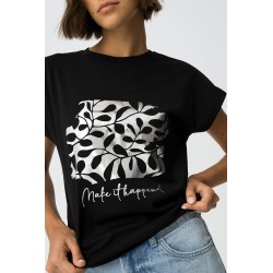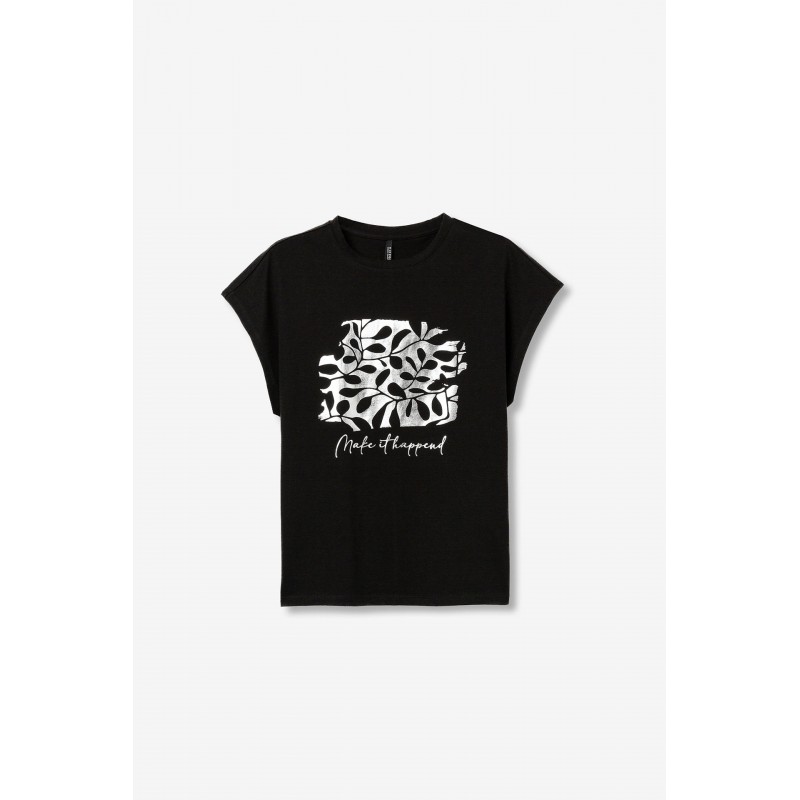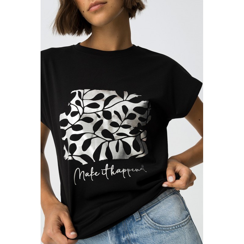 Camiseta estampada para mujer. Regular fit de algodón con estampado metalizado en el frente, cuello redondo y manga corta.