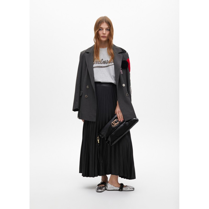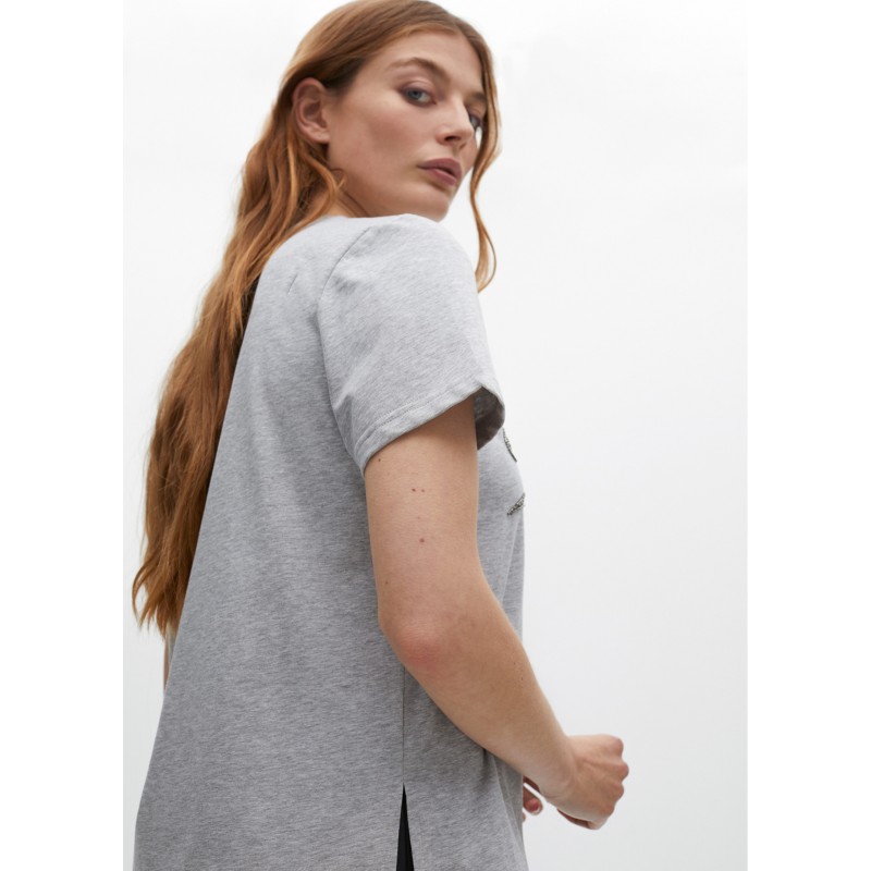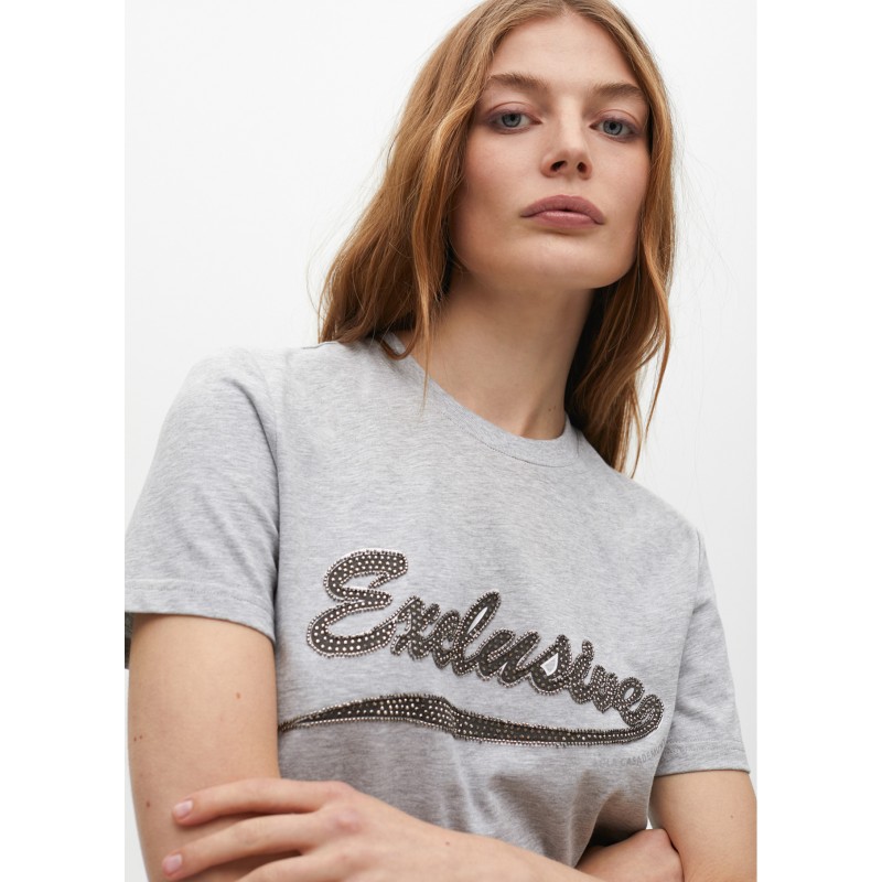 Camiseta de manga corta en suave algodón con un llamativo estampado posicional. Destaca por su exclusivo detalle de joyas en el pecho. Corte clásico y versátil, perfecta para combinar con faldas elegantes o vaqueros casual.
