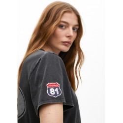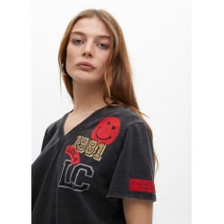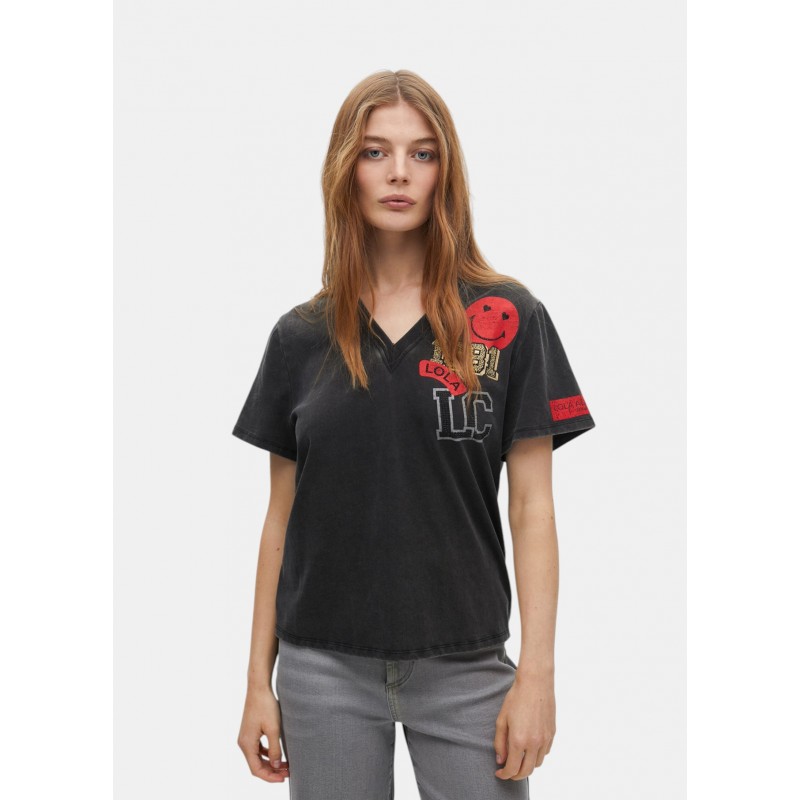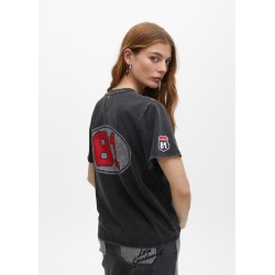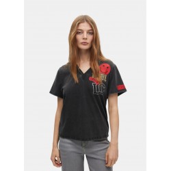 Camiseta de manga corta para mujer. En tejido lavado con detallados parches. Diseño moderno y cómodo con cuello en V. Perfecta para un look casual y estiloso. Hecha de algodón suave y duradero.
