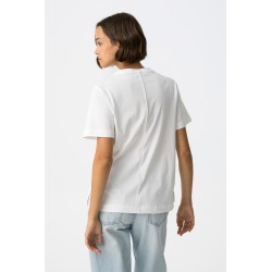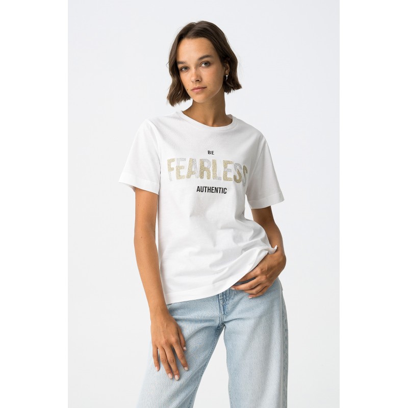 Camiseta para mujer de cuello redondo, estampado frontal con apliques y manga corta.