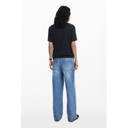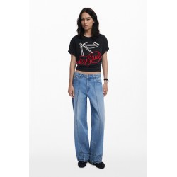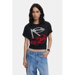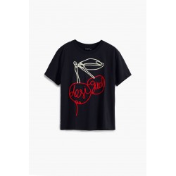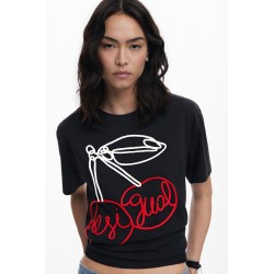 Camiseta de manga corta y cuello redondo en color liso con detalle 3D de cordón bordado con motivo de cerezas y logo.