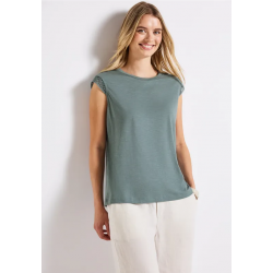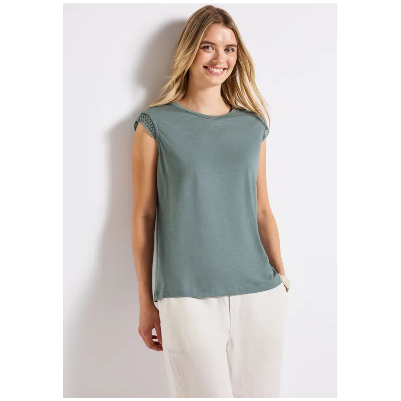 Camiseta basica para mujer. Detalles de crochet en los hombros caídos. El cuello redondo y la suave mezcla de algodón y modal garantizan un ajuste cómodo. Perfecta para looks relajados con un toque divertido.