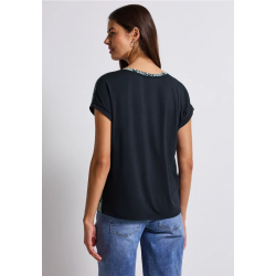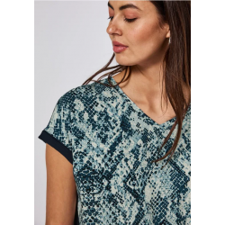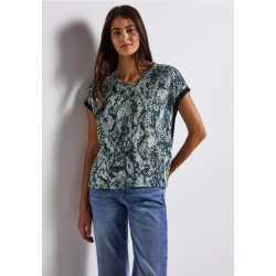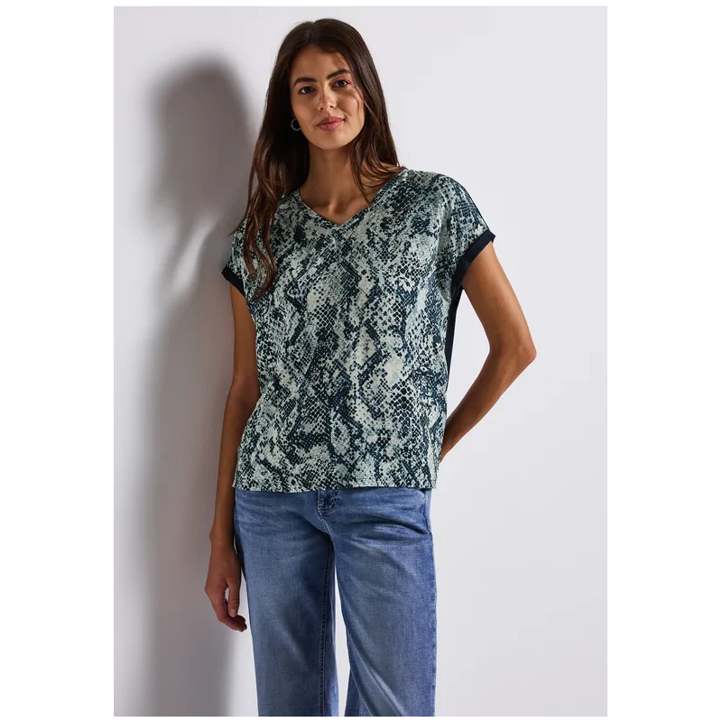Camiseta estampada para mujer. Presenta un delantero estampado de viscosa fluida y una espalda de jersey liso. El cuello en V y los hombros caídos informales garantizan un corte holgado. Ideal para looks femeninos de verano con un efecto llamativo.