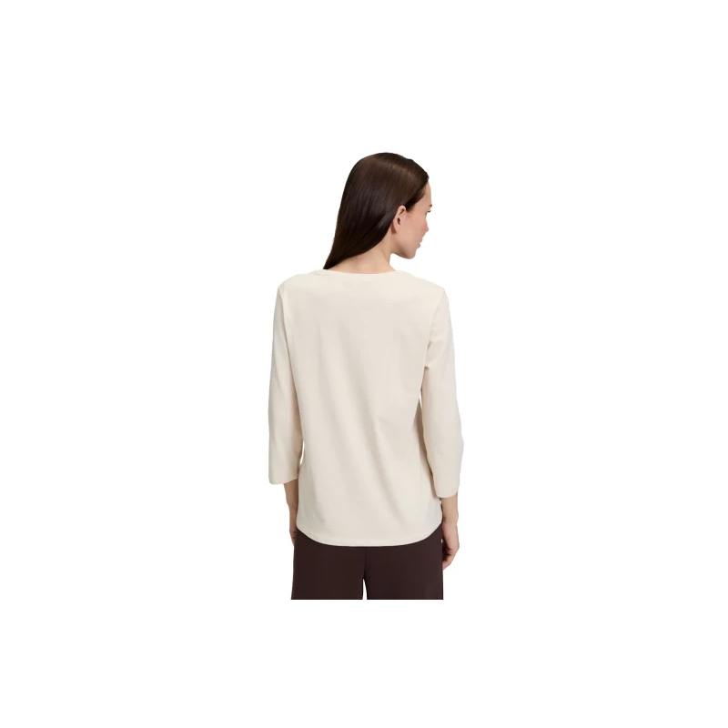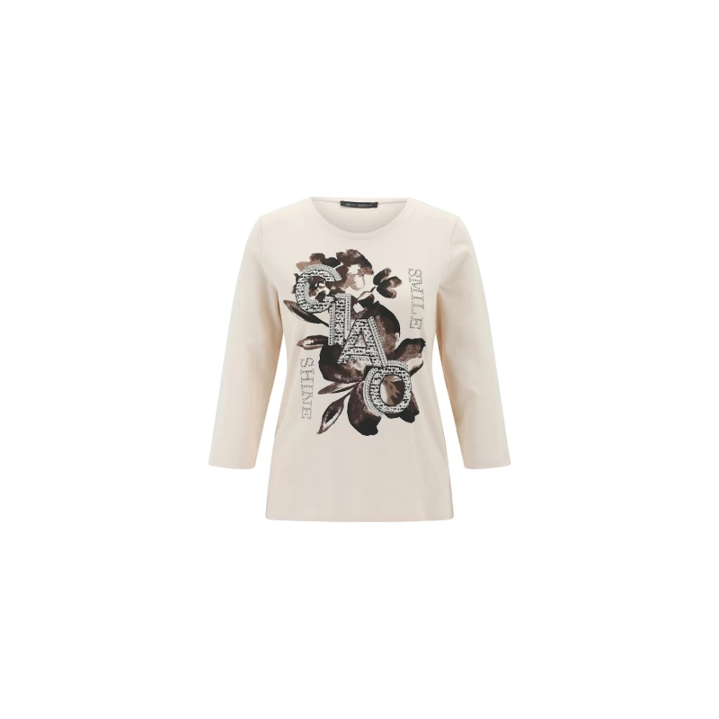 Camiseta estampada para mujer. Presenta mangas 3/4, cuello redondo, tejido de jersey suave y sutiles detalles de pedrería que le aportan un toque de brillo.