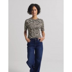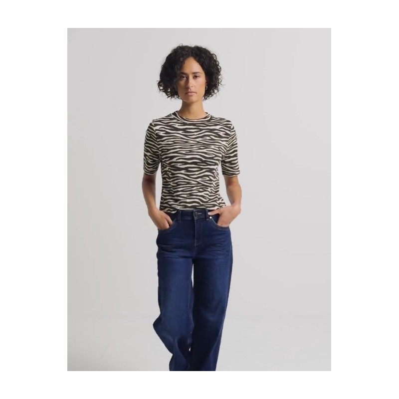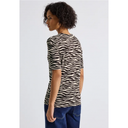 Camiseta estampada para mujer. El cuello alto y la suave mezcla de algodón y modal garantizan un ajuste cómodo y un toque moderno. Una prenda moderna y atractiva, ideal para conjuntos modernos y con personalidad.