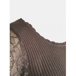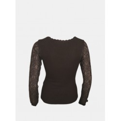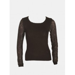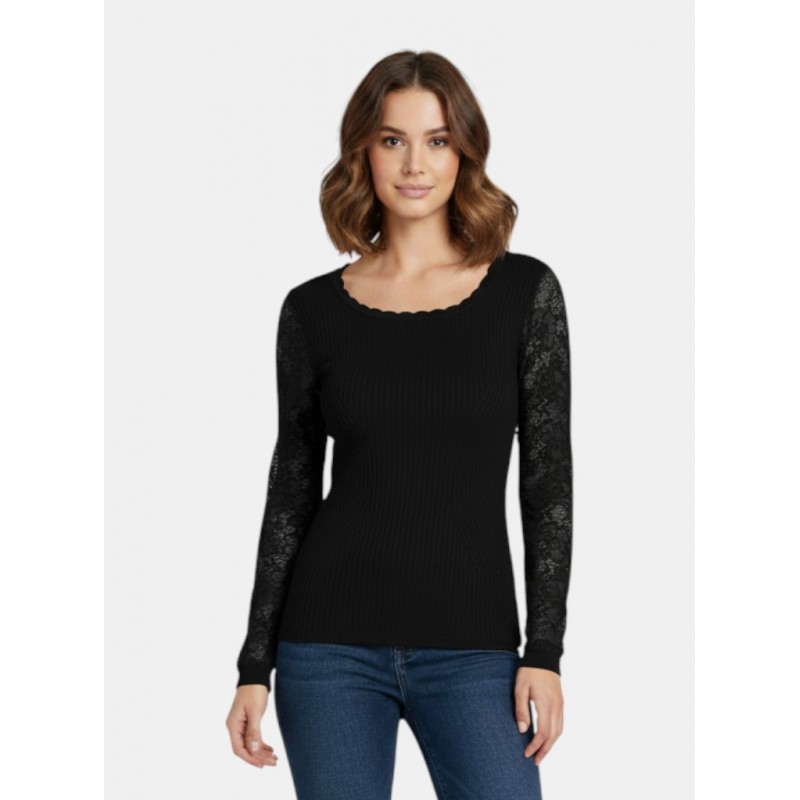 Camiseta para mujer de cuello redondo acanalado más bajo y puños de sus mangas largas de encaje.