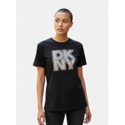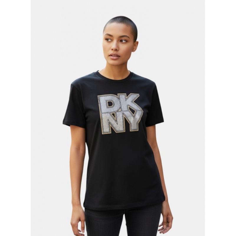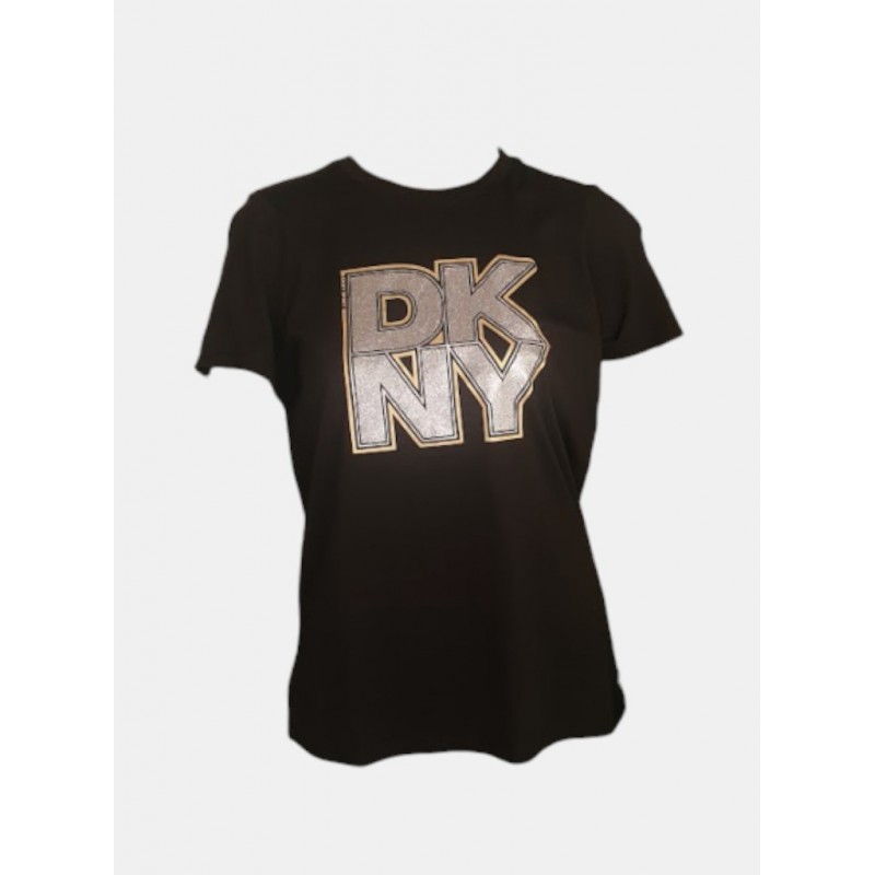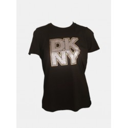 Camiseta para mujer de diseño de logo en la parte frontal, cuello redondo y manga corta.