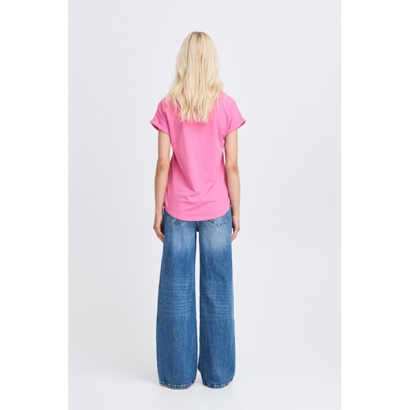 Camiseta basica para mujer. Presenta un corte holgado, mangas cortas remangadas y un cuello redondo clásico. El tejido suave y elástico ofrece gran comodidad.