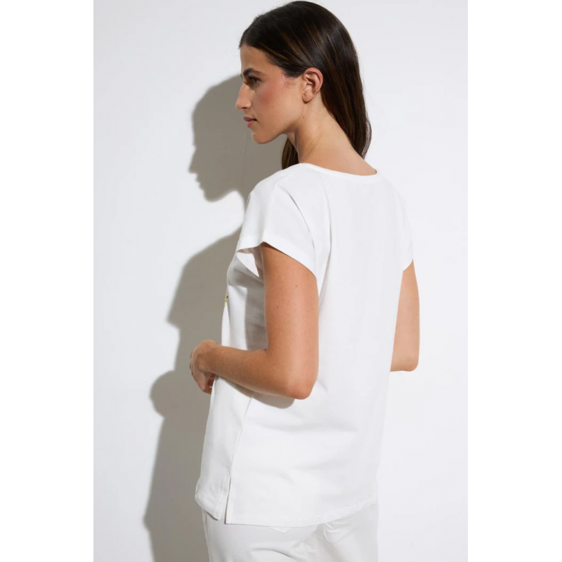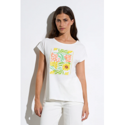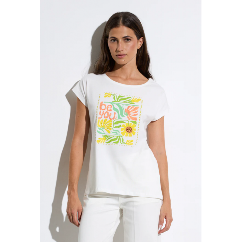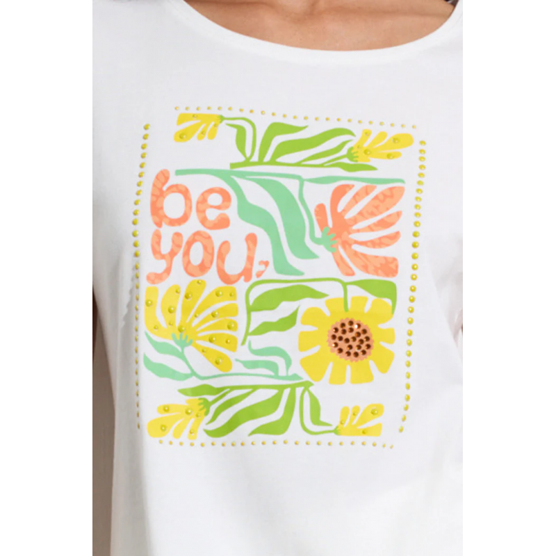 Camiseta de manga corta para mujer. Cuello redondo con ilustración central de girasoles y mensaje "be you". Corte ligeramente ajustado. Bajo recto.