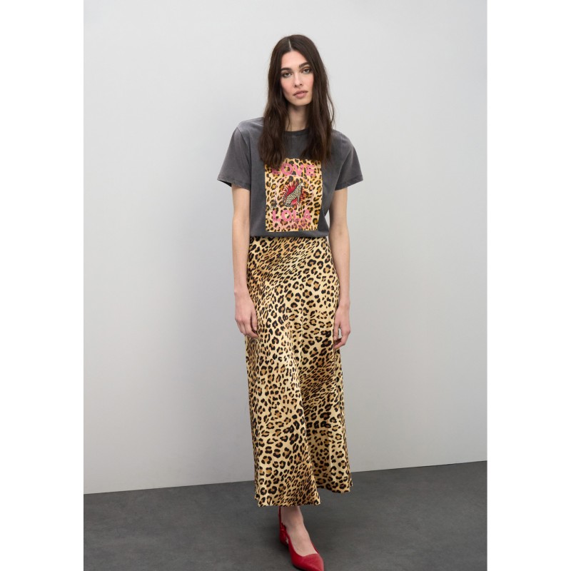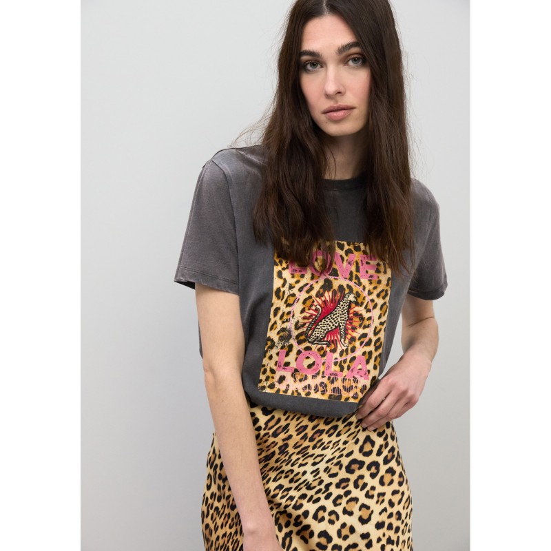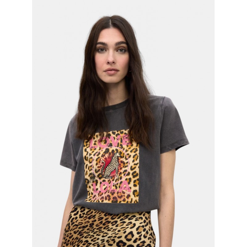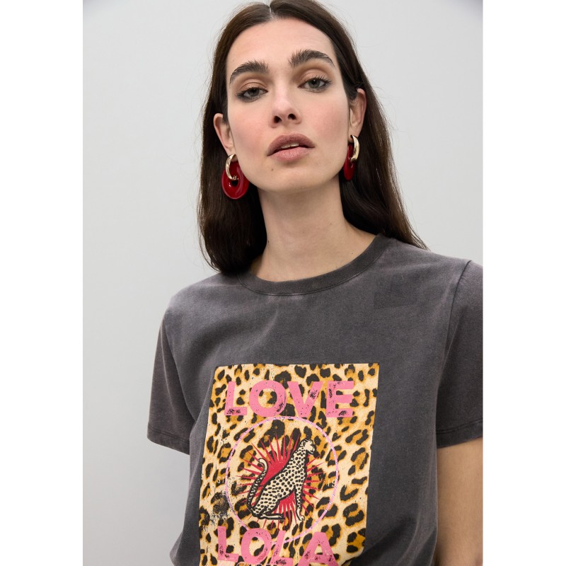 Camiseta en algodón suave con un estampado vibrante de leopardo y el distintivo logo LOVE LOLA. Corte clásico y manga corta para un ajuste confortable. Ideal para añadir un toque moderno y atrevido a tu look diario.