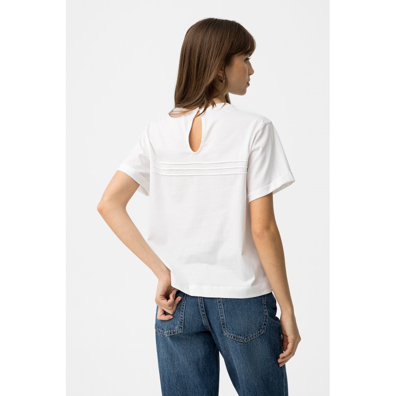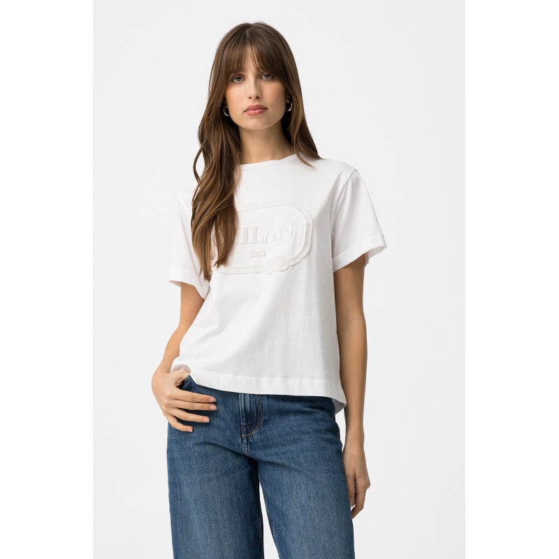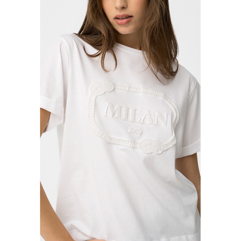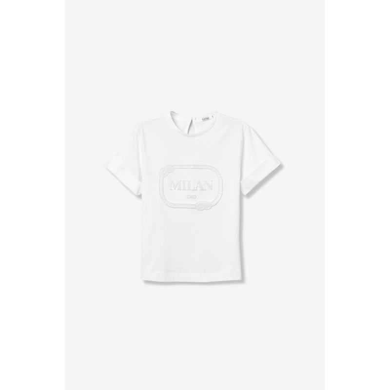Camiseta blanca de corte recto, manga corta, bordado MILAN delante y cierre discreto en la espalda.