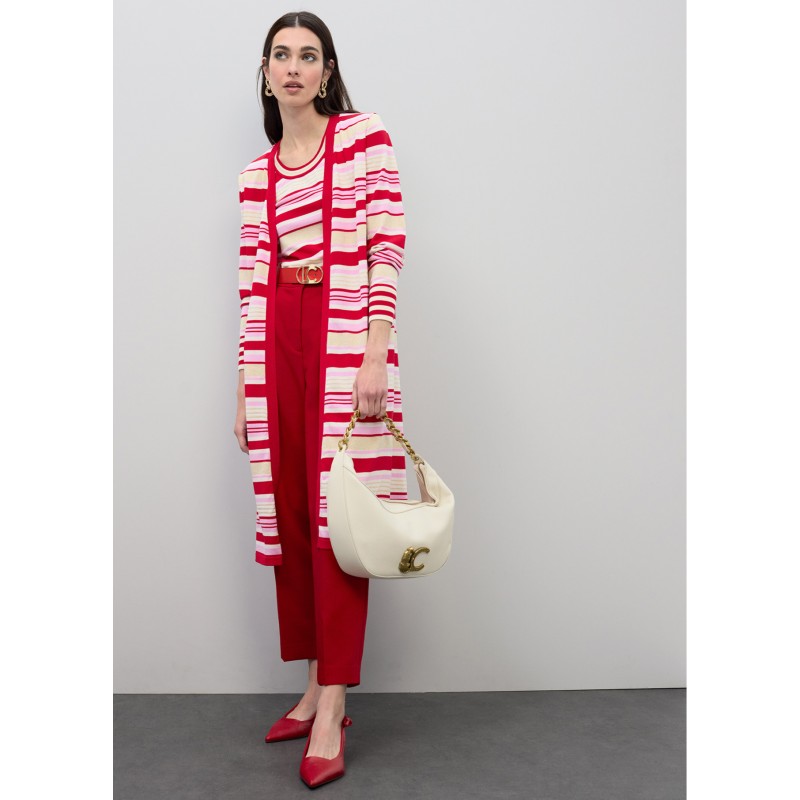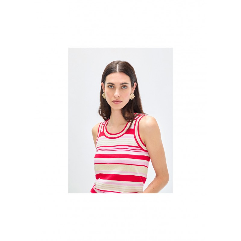 Top sin mangas de punto tricolor, con diseño de rayas en rojo, rosa y beige. Tejido suave y ajustable, perfecto para combinar en looks casuales. Escote redondo y detalles ribeteados en contraste.