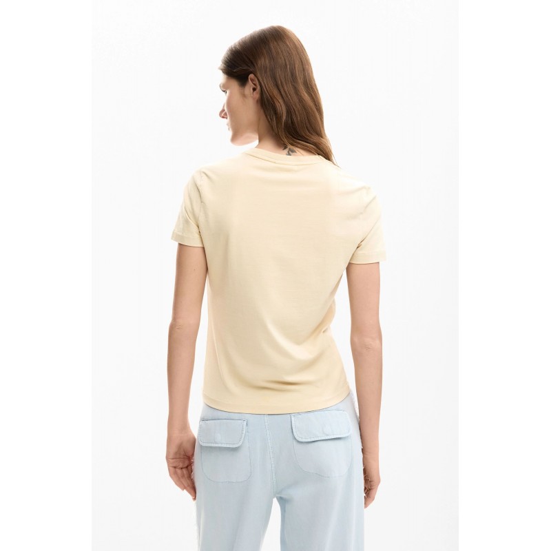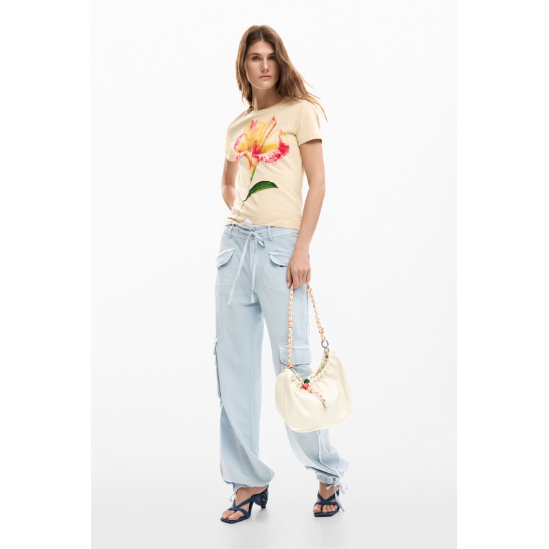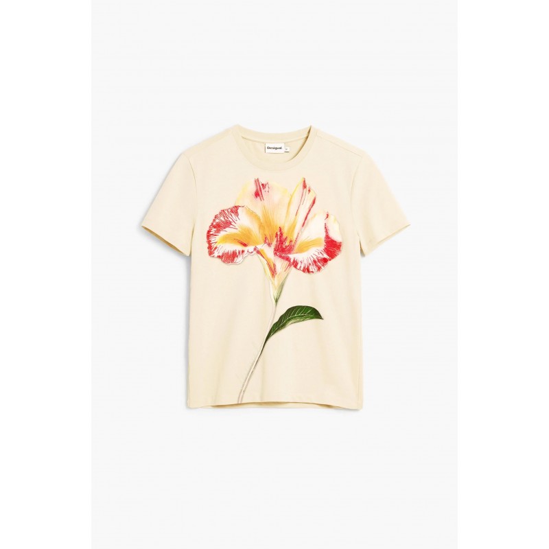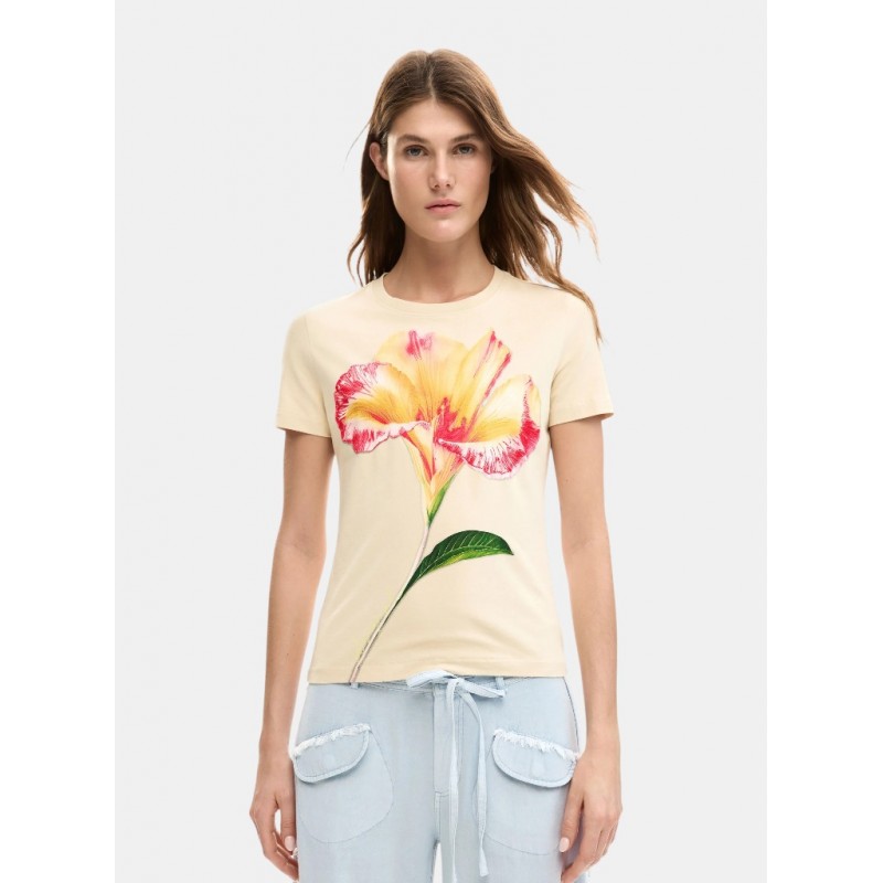 Camiseta de corte regular con estampado frontal de flor tipo hibiscos en estilo artístico con efecto de pinceladas, cuello redondo y manga corta.