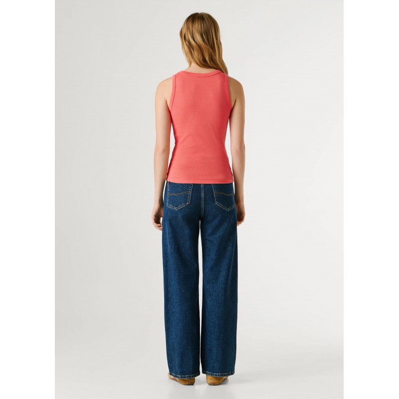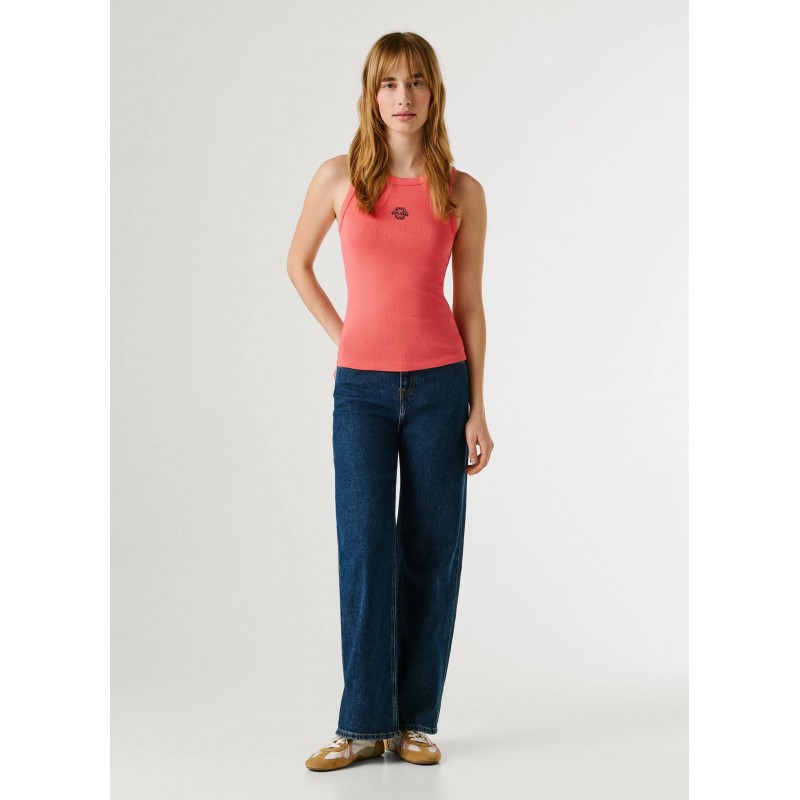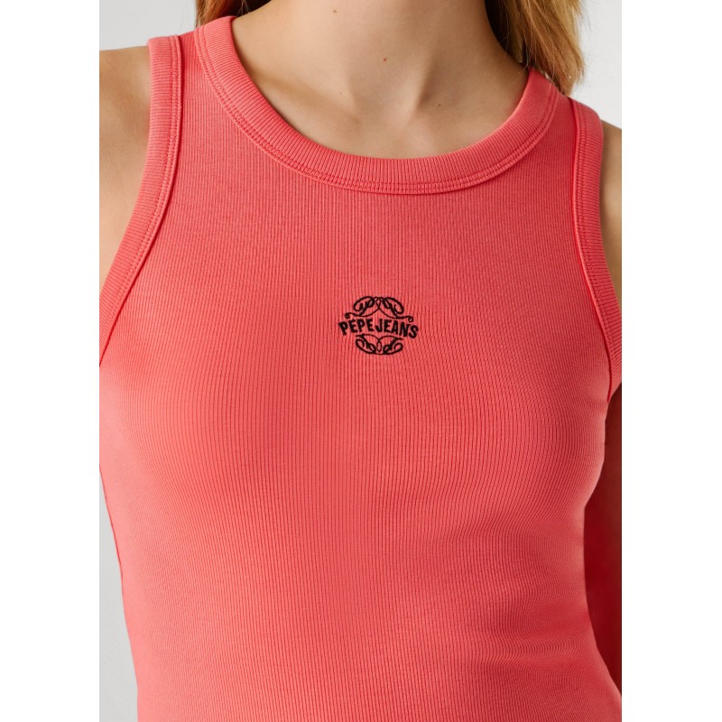 Top para mujer de cuello redondo, logo de la marca bordado a contraste en el pecho y de asillas.