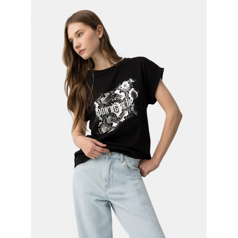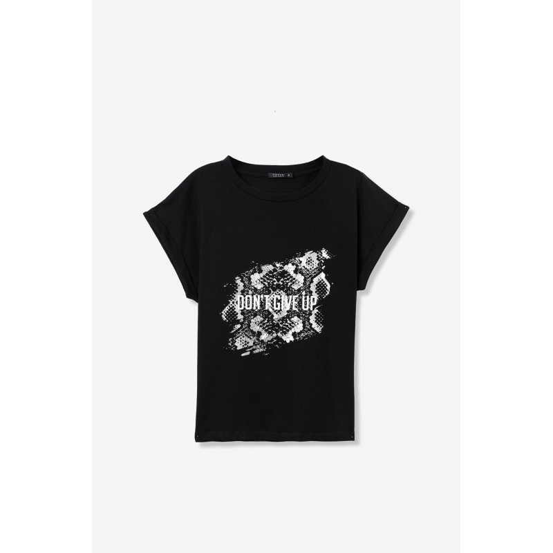 Camiseta de corte regular, manga corta, con estampado gráfico y mensaje frontal.
