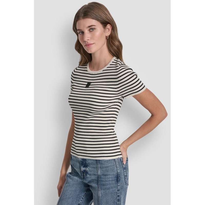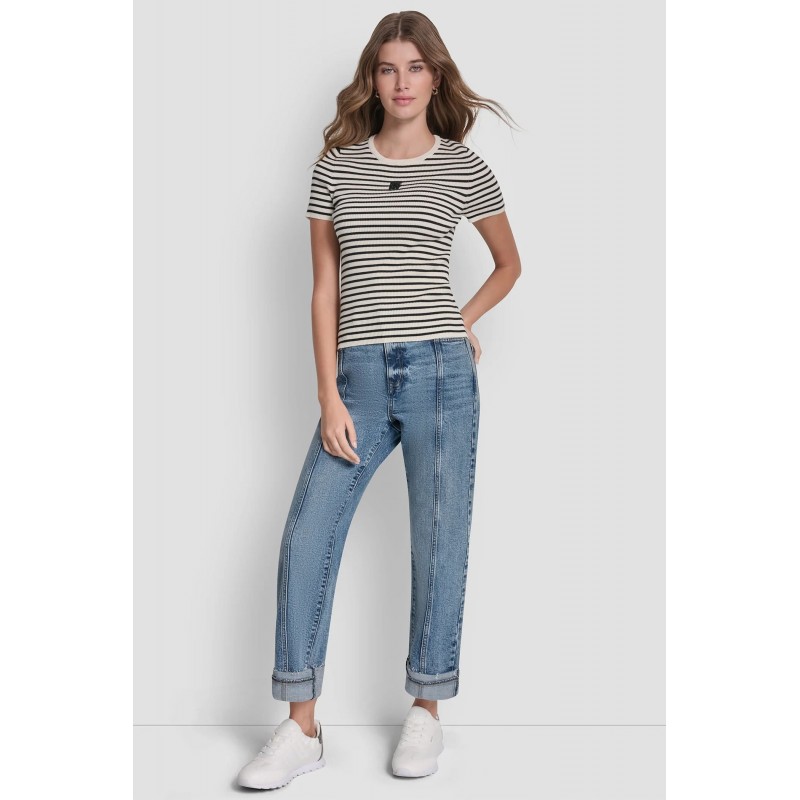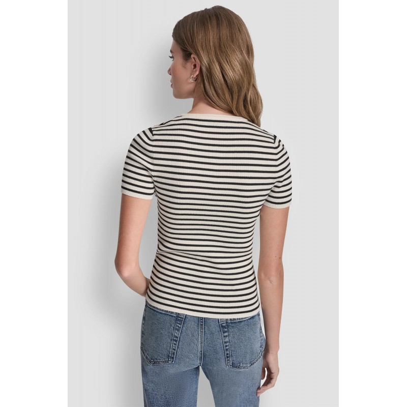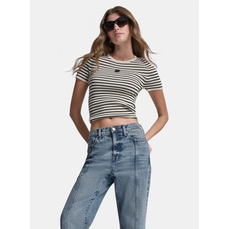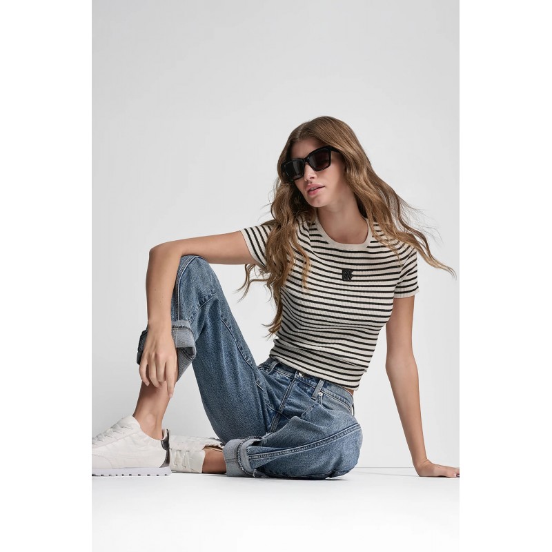 Camiseta en tejido acanalado a rayas, es el estilo esencial de todos los días que eleva instantáneamente su armario. Diseñado con un corte ajustado favorecedor y un escote redondo clásico, es perfecto por sí solo o en capas debajo de las chaquetas durante todo el año.