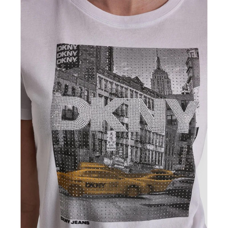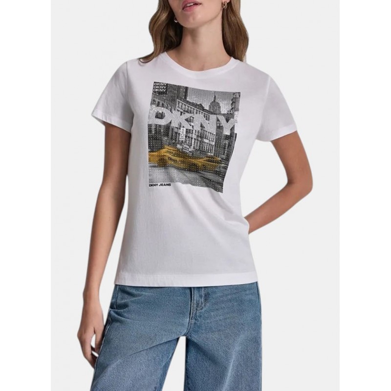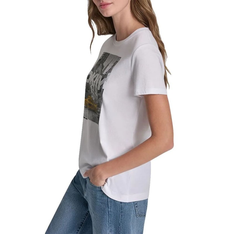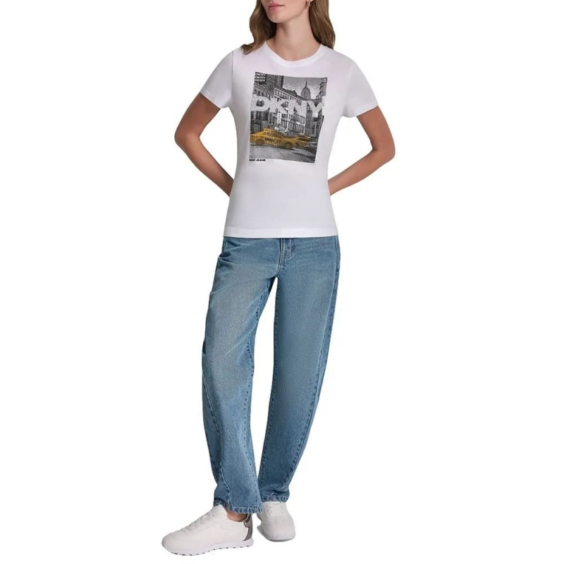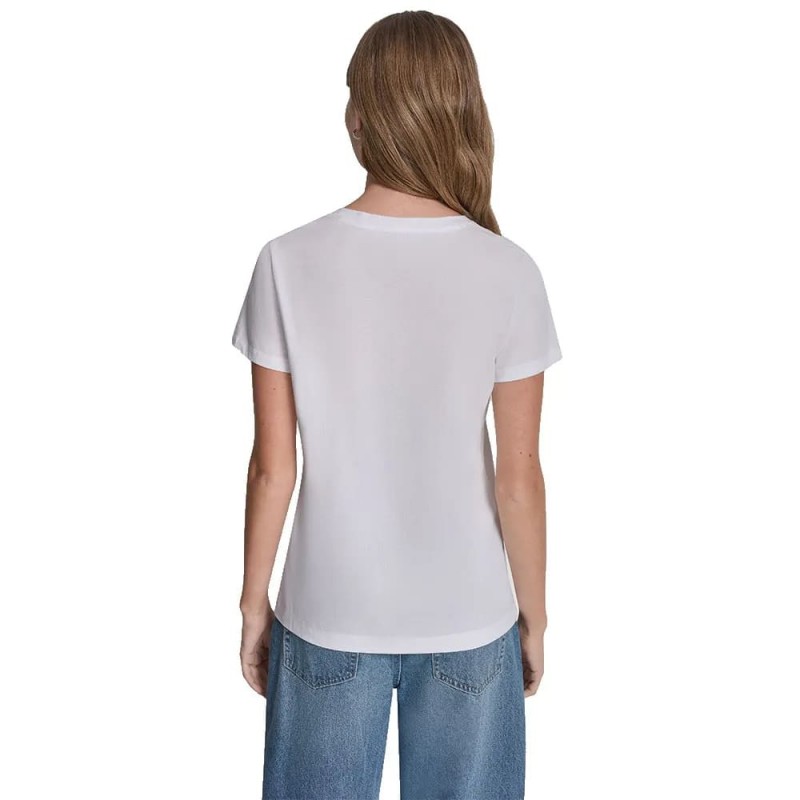 La camiseta de mujer ofrece un ajuste regular que se asienta de forma natural sin tirar ni exceso de tela. De la colección DKNY Jeans, esta camiseta funciona como una opción confiable.