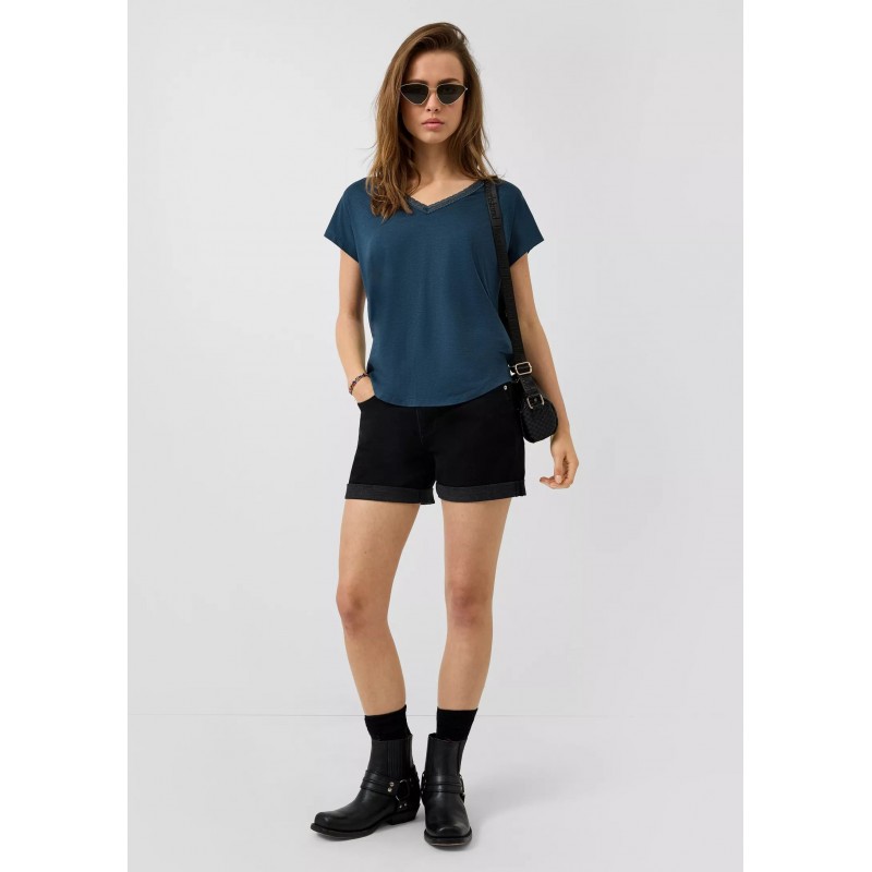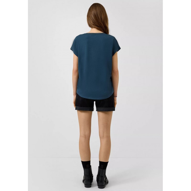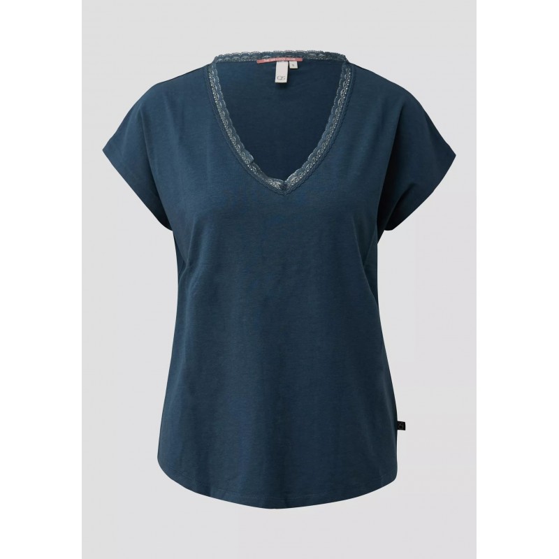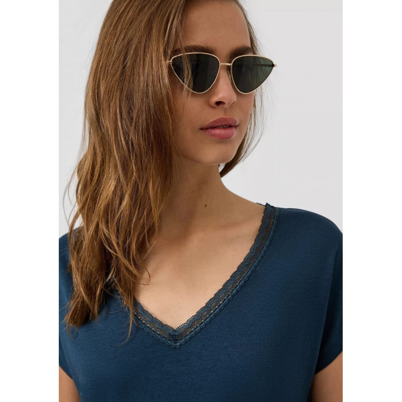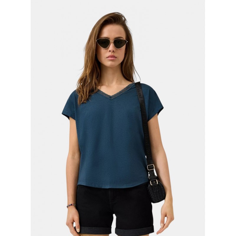 Camiseta para mujer de escote en V de encaje, bajo redondeado y manga corta murciélado.