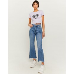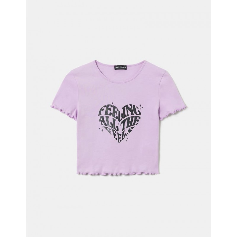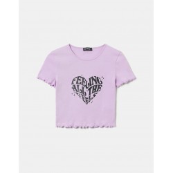 Camiseta mujer estampada de cuello redondo y volantes en sus mangas cortas y bajo.