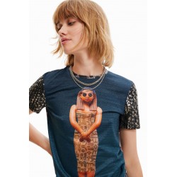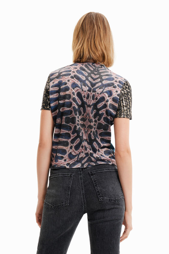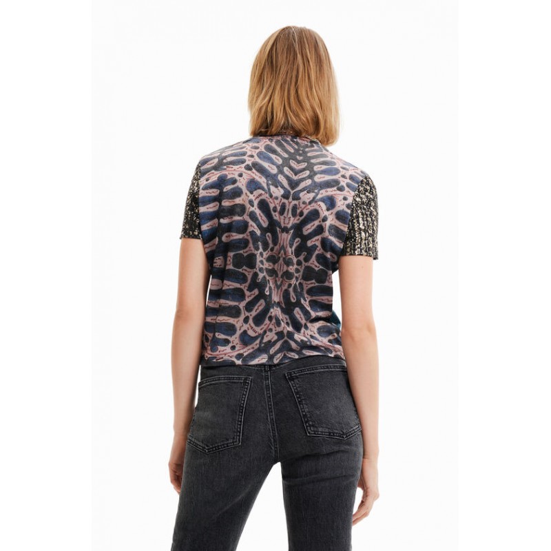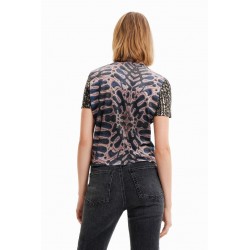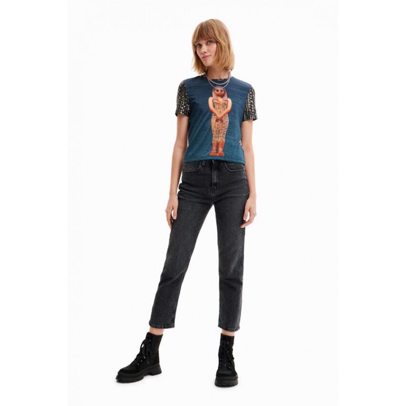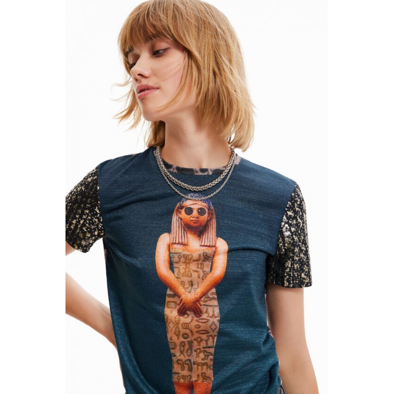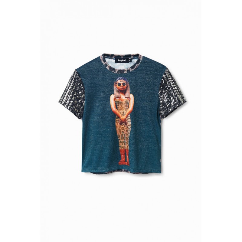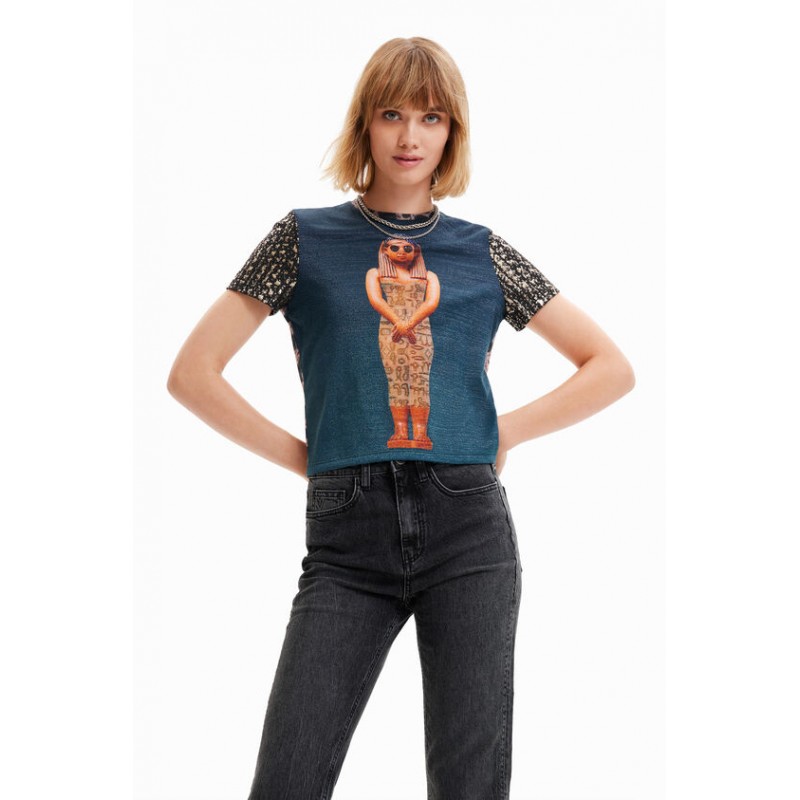 Estampado collage fotográfico digital de inspiración egipcia y estampados diferentes en mangas y espalda, que caracterizan a esta camiseta ajustada de manga corta. Cuello redondo largo cropped y slim fit.