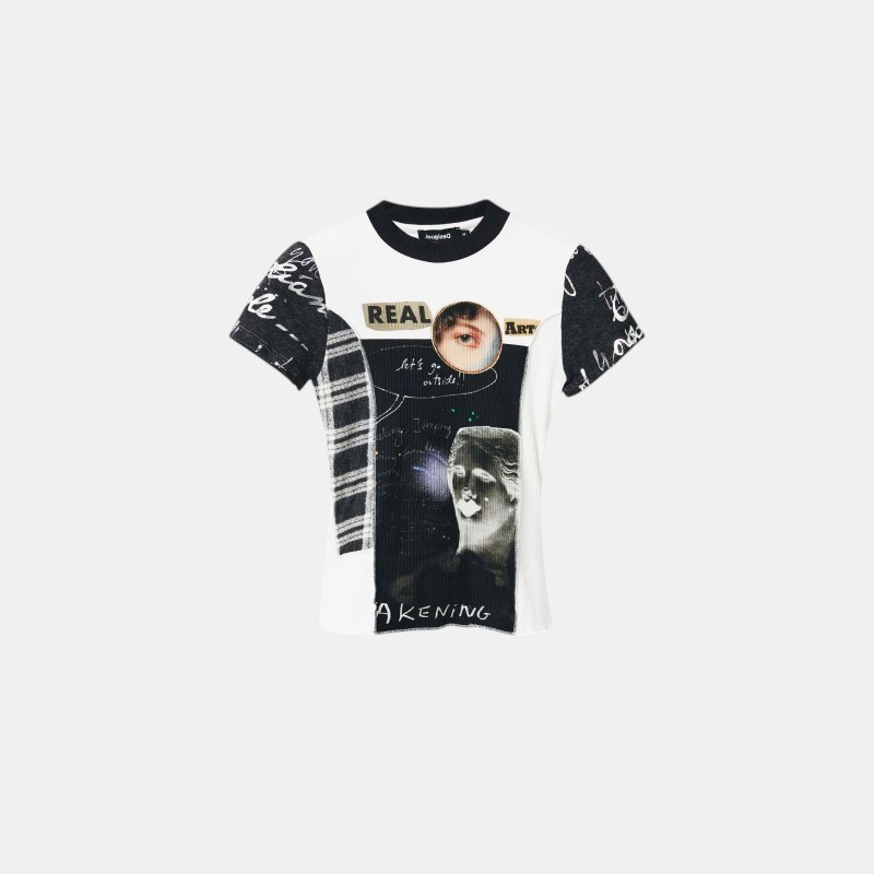Esta camiseta cropped de manga corta, de algodón con textura acanalada, está estampada con patch de textos estilo periódico, efecto handmade, tartanes y fotos artísticas. Cuello alto con logo Desigual en el frente con efecto brillante. Slim fit.