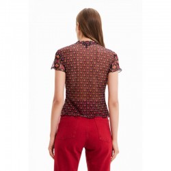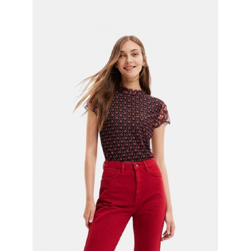 Estampado gráfico retro en esta camiseta slim fit con propiedades stretch, con espalda y manga corta semitransparente. Cuello redondo,manga corta y largo cropped.