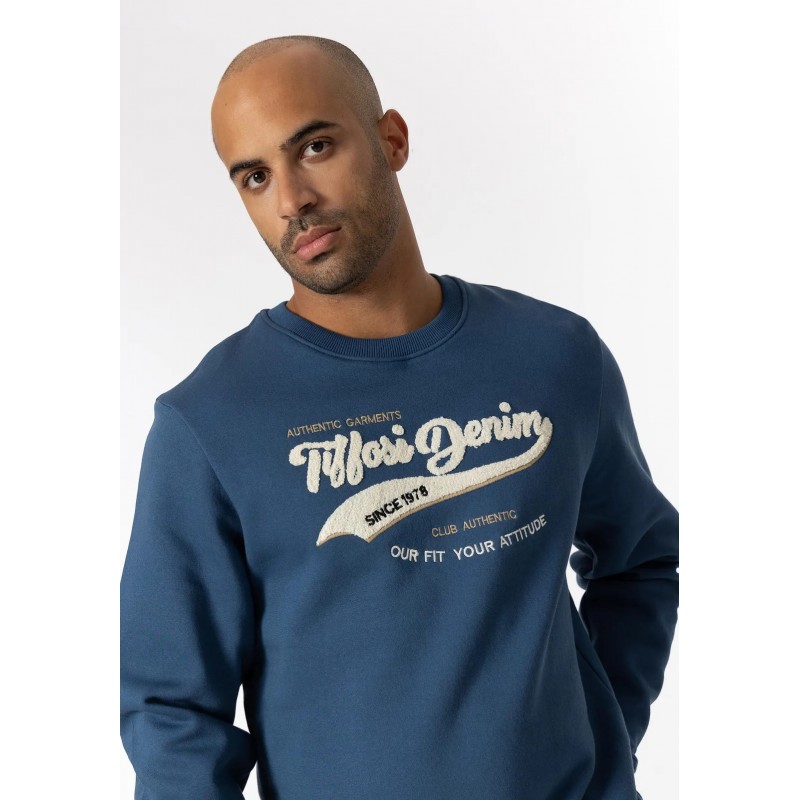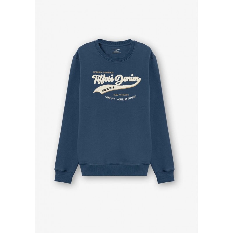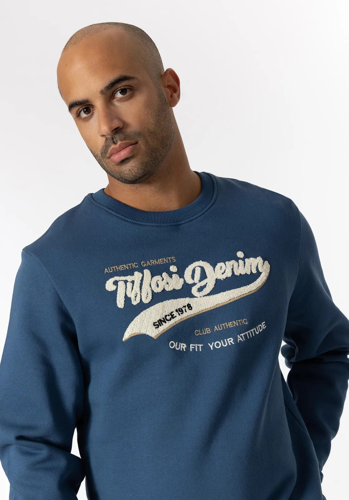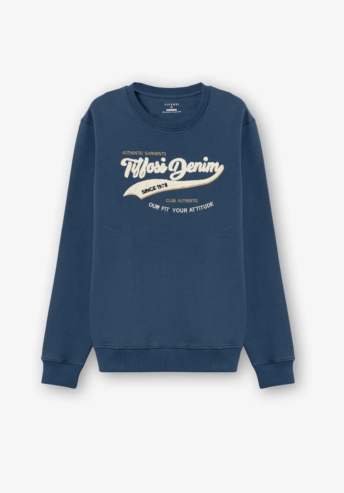 Jersey regular fit cardada con cuello redondo y manga larga. Bordado frontal tipo toalla. Terminaciones de canalé.