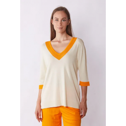 Jersey bicolor para mujer de cuello en pico con detalle calado y manga 3/4.