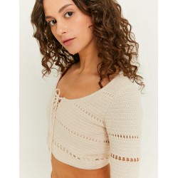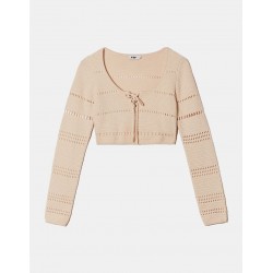 Cardigan corto en crochet para mujer. Mangas largas. Detalle de nudo en el pecho.