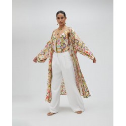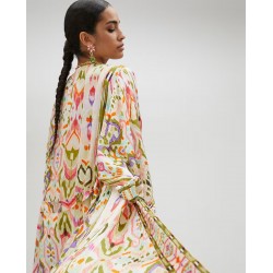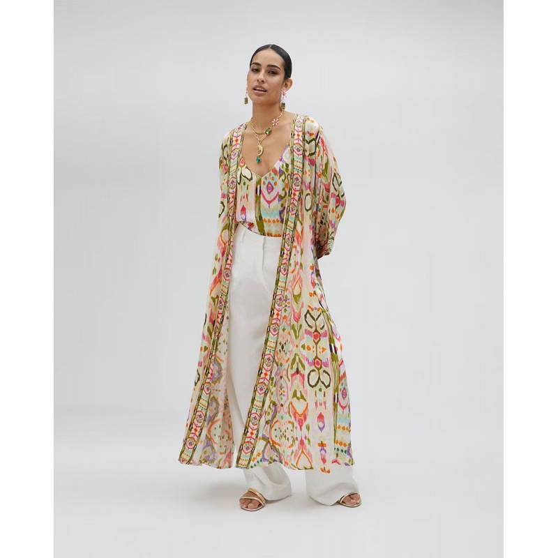 Kimono sedoso con manga japonesa y estampado étnico, tira en cintura a modo de cinturón.