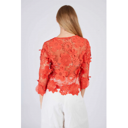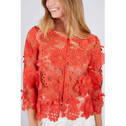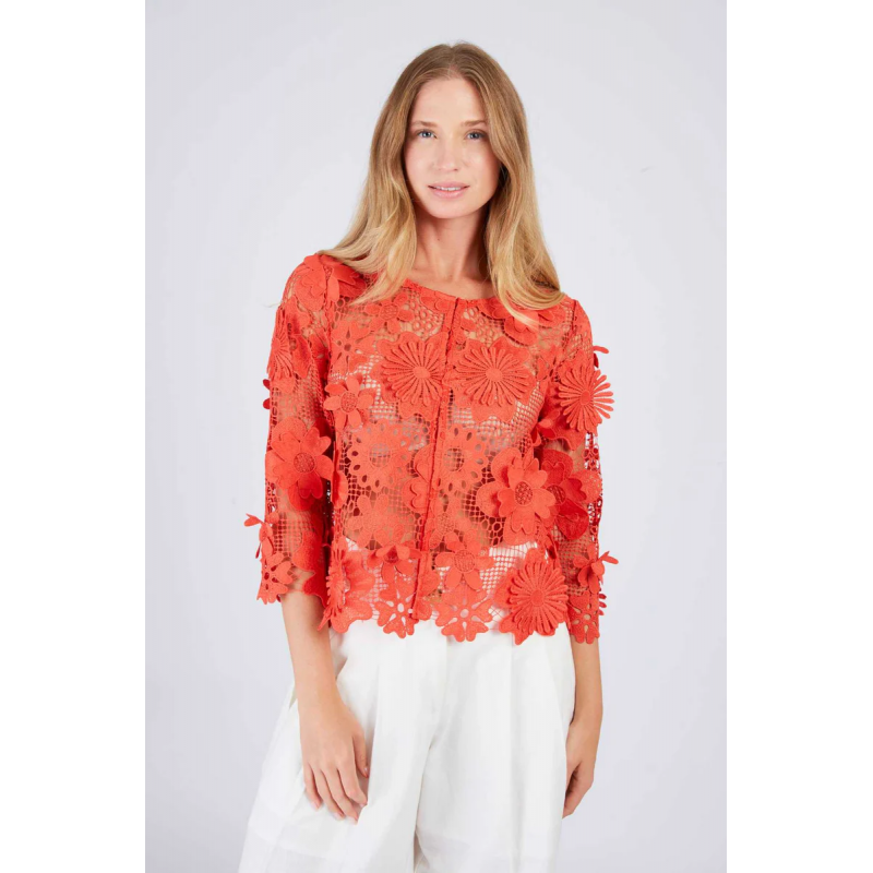 Chaqueta corta de encaje para mujer. Mangas tres cuartos. Escote redondo con abertura frontal. Estampado floral en relieve sobre toda la prenda. Detalles de flores aplicados en 3D que crean un efecto texturizado lujoso. Cierre discreto con ganchos y ojales en el cuello. Esta pieza es perfecta para un look sofisticado.