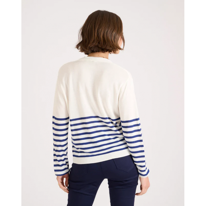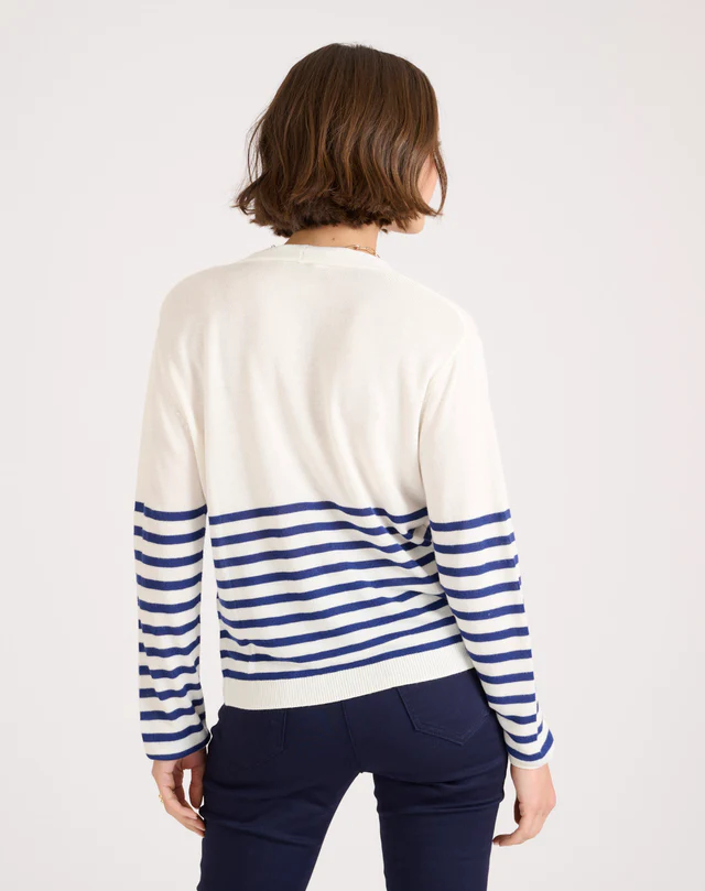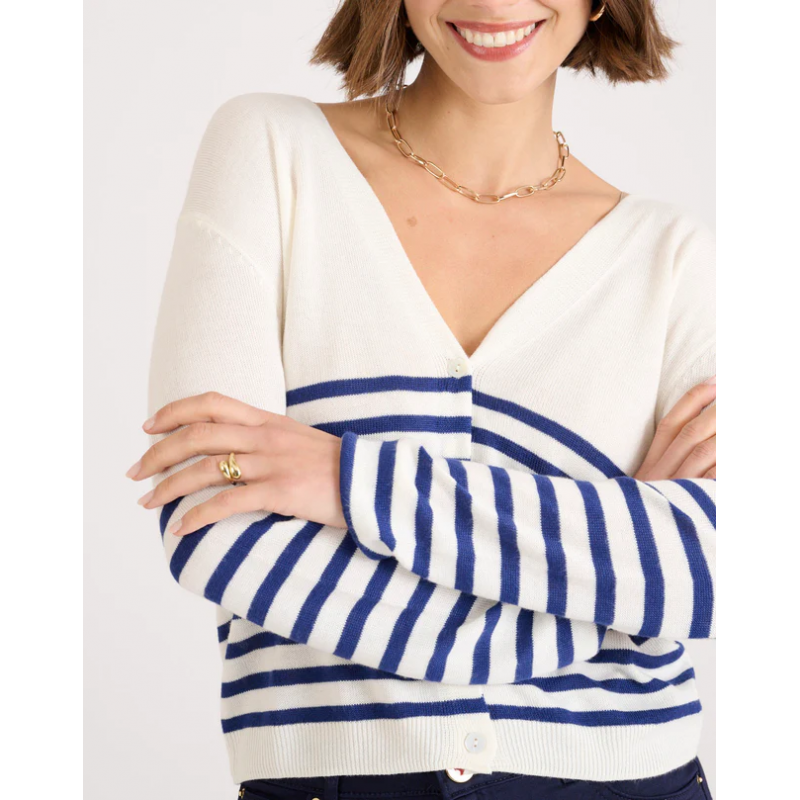 Cardigan con cuello pico para mujer. Botones delanteros. Estampado de rayas horizontales. De punto fino.