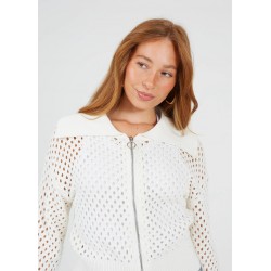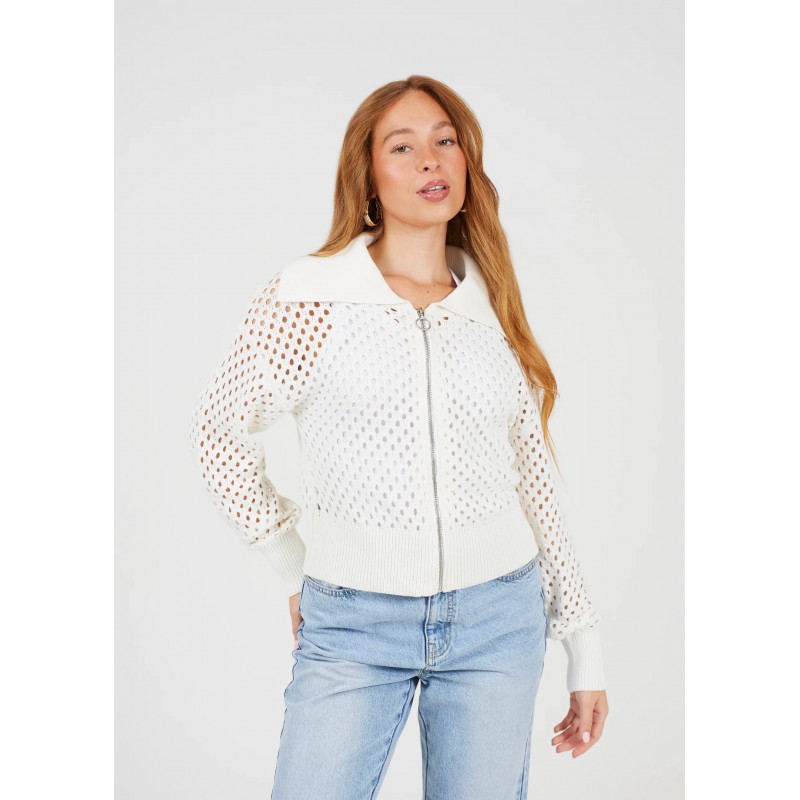 Cárdigan de punto para mujer de cuello de solapa y redondo acanalado, cierre de cremallera y puños de sus mangas bajas acanalados.