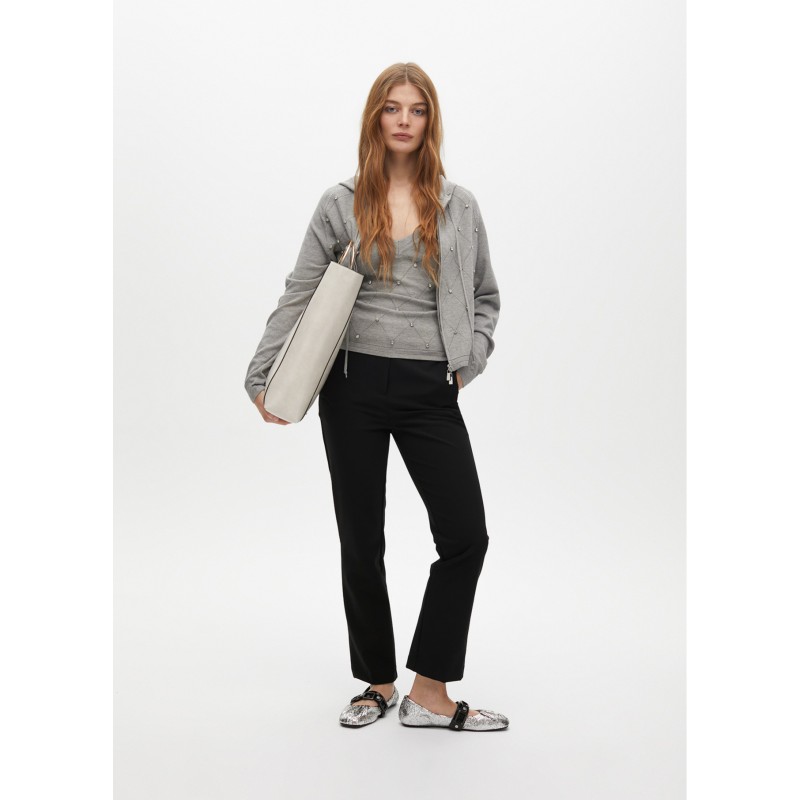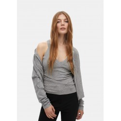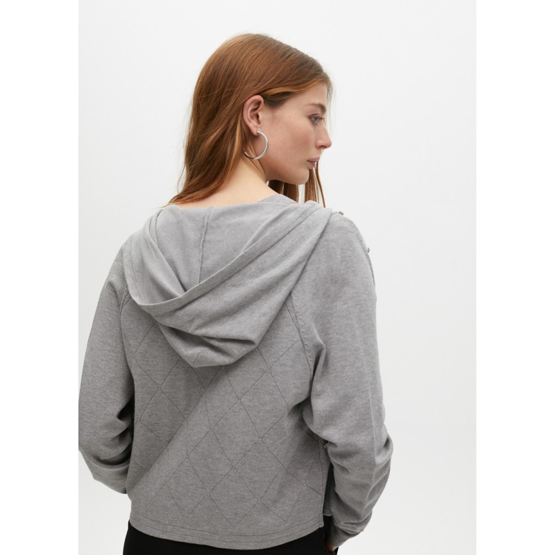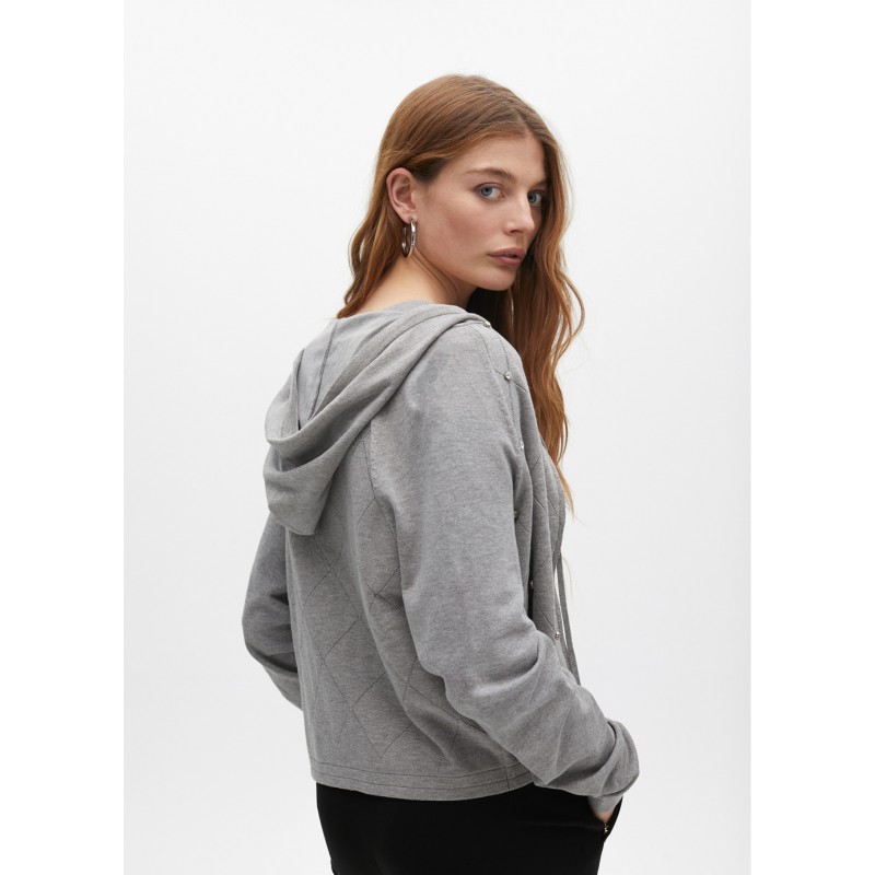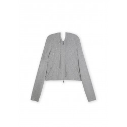 Cárdigan en punto suave con detalle de pedrería en la parte delantera. Cierre de cremallera completo y capucha ajustable. Ideal para un look casual con un toque sofisticado. Mangas largas y ajuste cómodo.