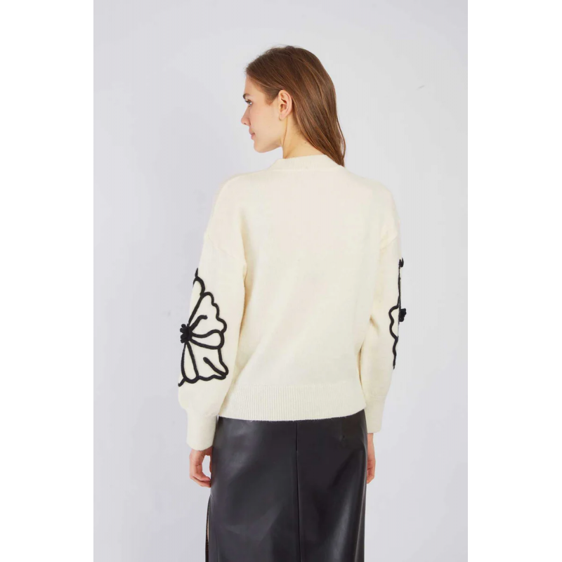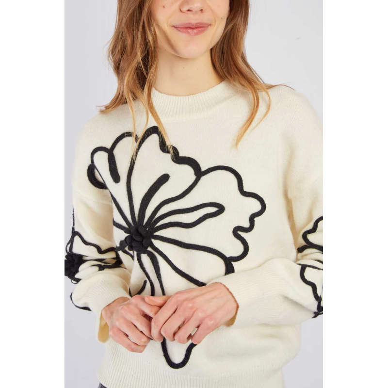 Sueter de punto suave para mujer. Texturizado con un estampado floral que le da un toque femenino. Corte recto con puños, cuello redondo y bajo acanalados para un ajuste cómodo. Llévalo entretiempo o en invierno para un look acogedor y sofisticado.