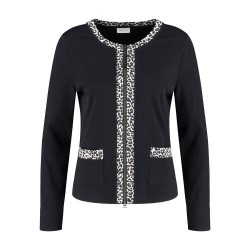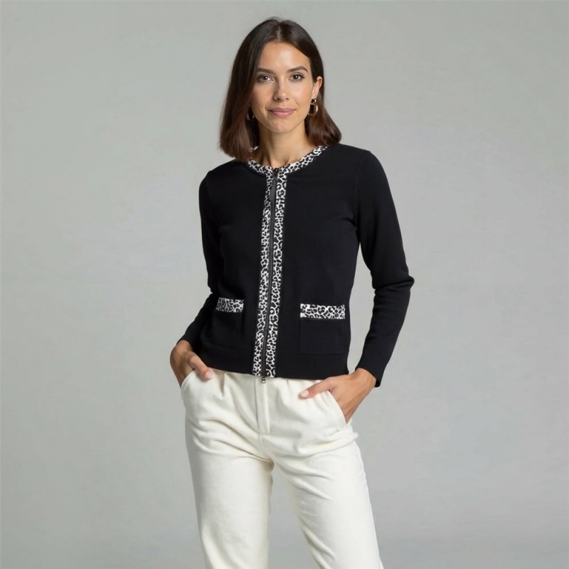Cardigan de punto para mujer. Presenta sutiles detalles de estampado animal en el cuello, la tapeta con cremallera y los bolsillos. Una prenda versátil para combinar con otras prendas, perfecta para realzar conjuntos de diario con detalles discretos.