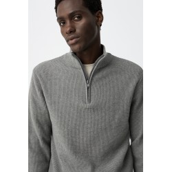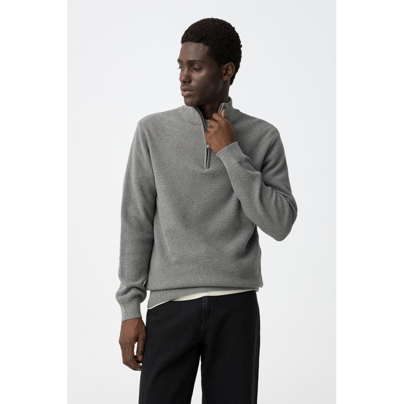 Jersey de punto texturizado para hombre. Cuello alto con media cremallera metálica. Puños y bajo en rib.