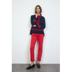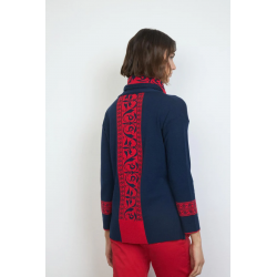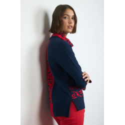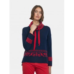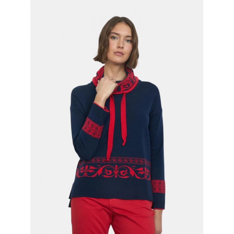 Jersey estampado para mujer de cuello vuelta con detalle de estampado, franja a contraste y cordón ajustable coordinado y manga larga acabada en puño con detalle de estampado y franja a contraste, bajo recto con aberturas laterales y más largo por detrás.