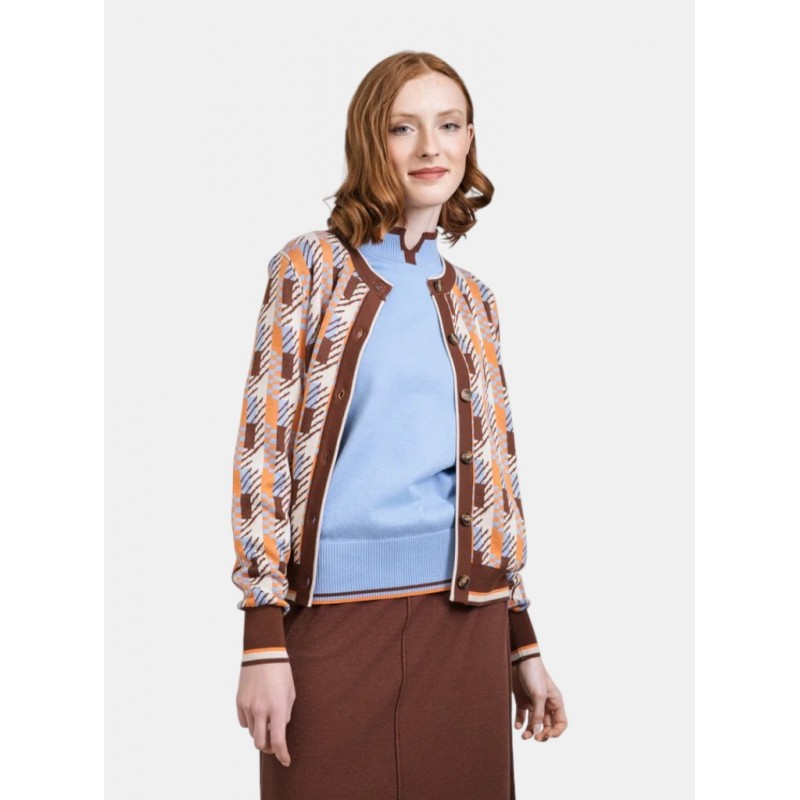 Cárdigan estampado para mujer de cierre de botones con cuello redondo y sus mangas largas ribeteadas.