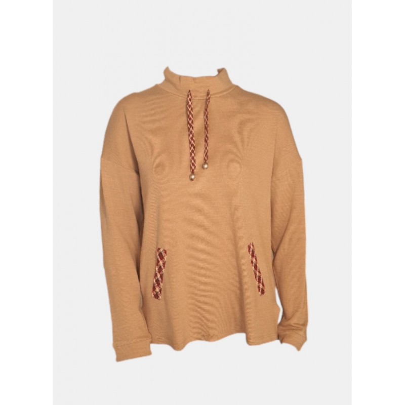 Sudadera para mujer de cuello alto con cordón ajustable de estampado de cuadros,  bolsillos con ribete estampado a juego y mangas largas.