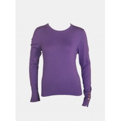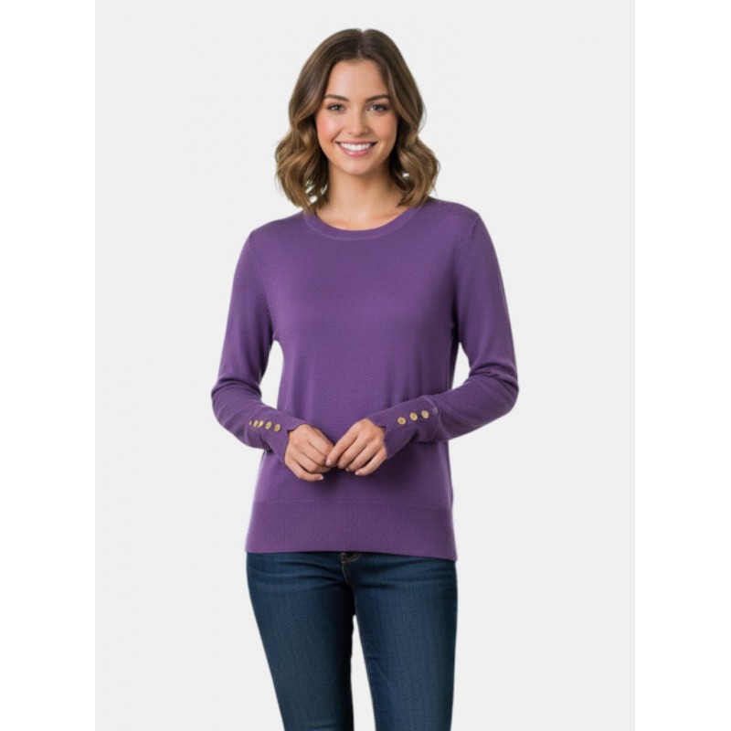 Jersey para mujer de cuello redondo y mangas largas con diseño de tres botones metálicos.