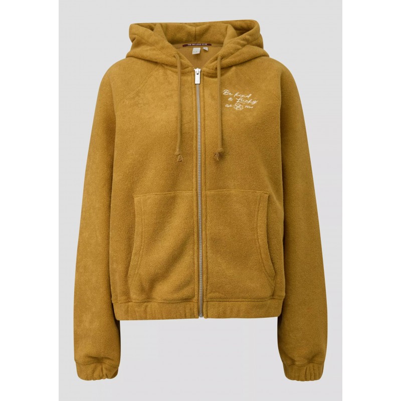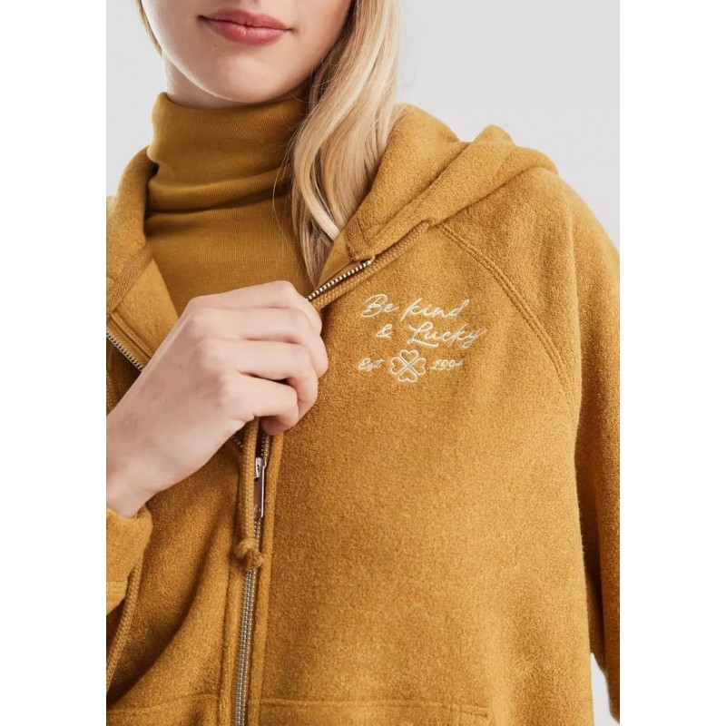 Sudadera para mujer de capucha con cordones ajustables, cierre de cremallera, bolsillos laterales, diseño en el pecho bordado y cintura y mangas largas elásticas y fruncidas.