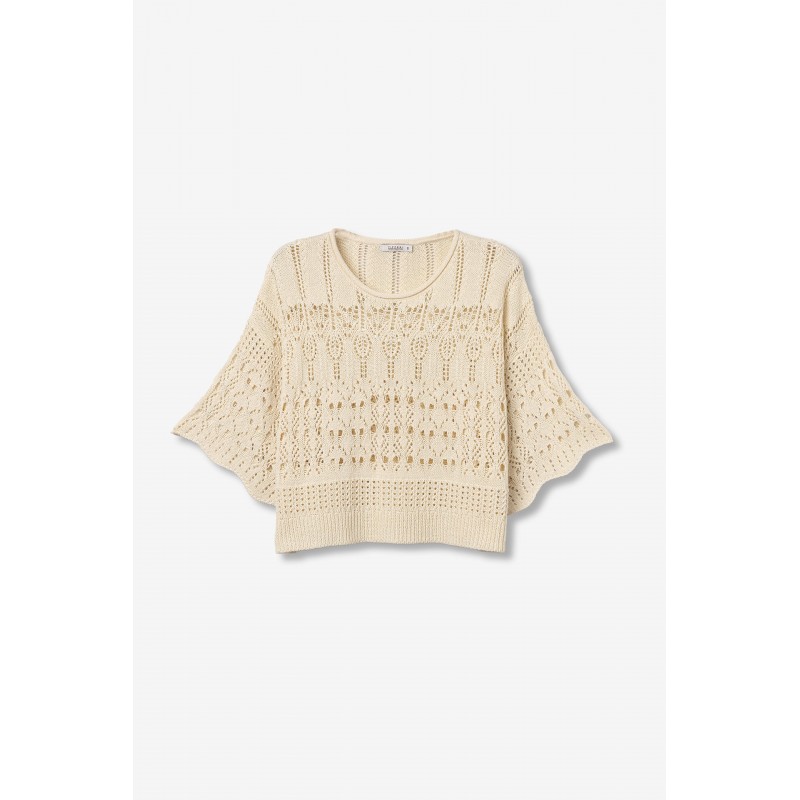 Corte ancho y corto, manga caída, en color beige claro, con detalles calados y estilo boho.