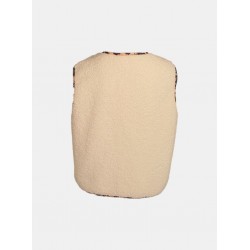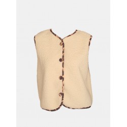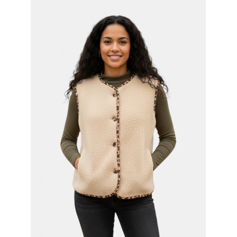 Chaleco borregito para mujer de ribete alrededor del cuello redondo, más a lo largo de cierre abotonado y la parte sin marca en animal print.