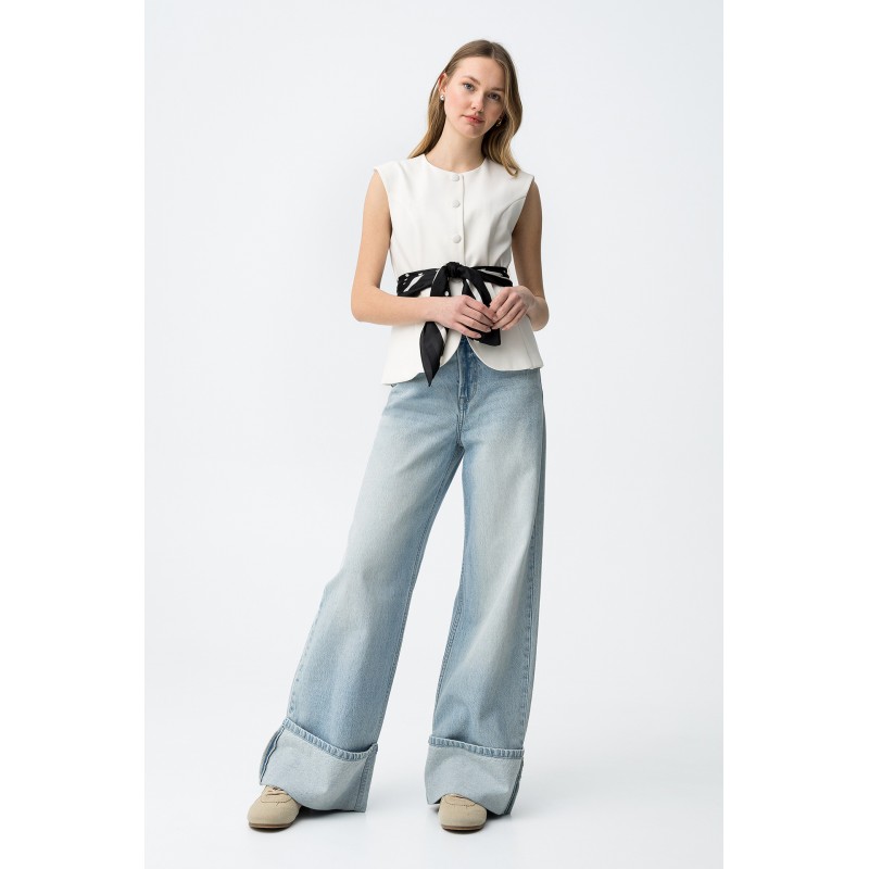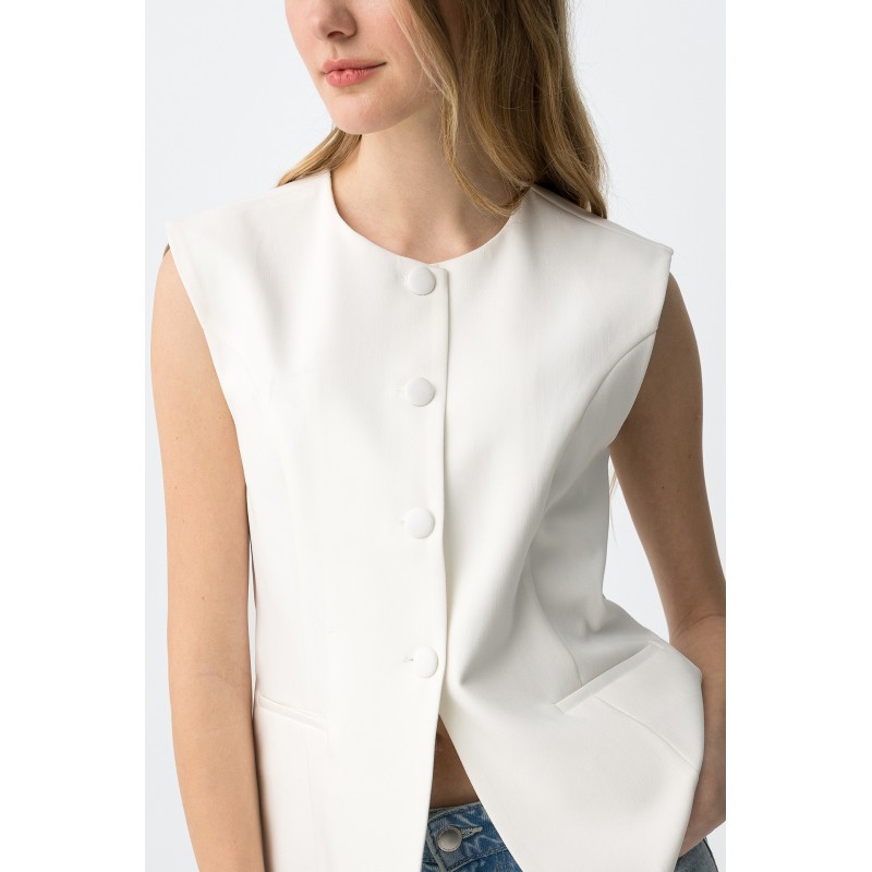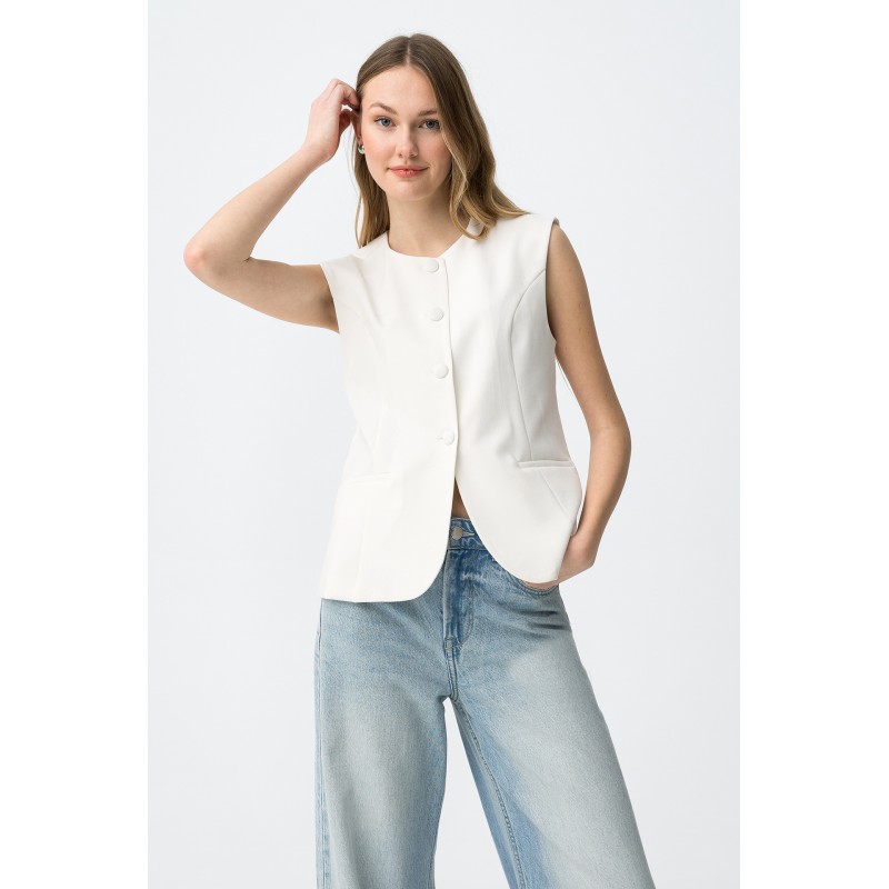 Chaleco oversize para mujer de cuello redondo, bolsillos delanteros y bajo.