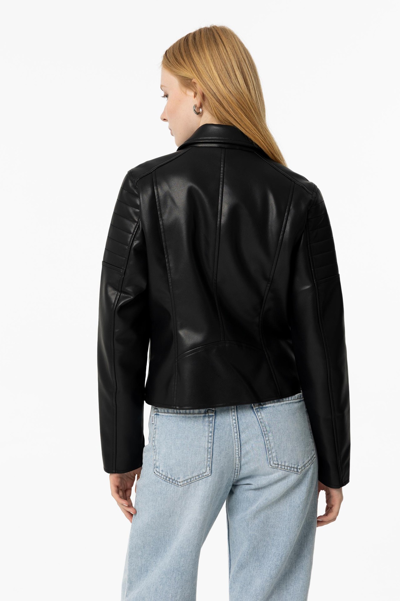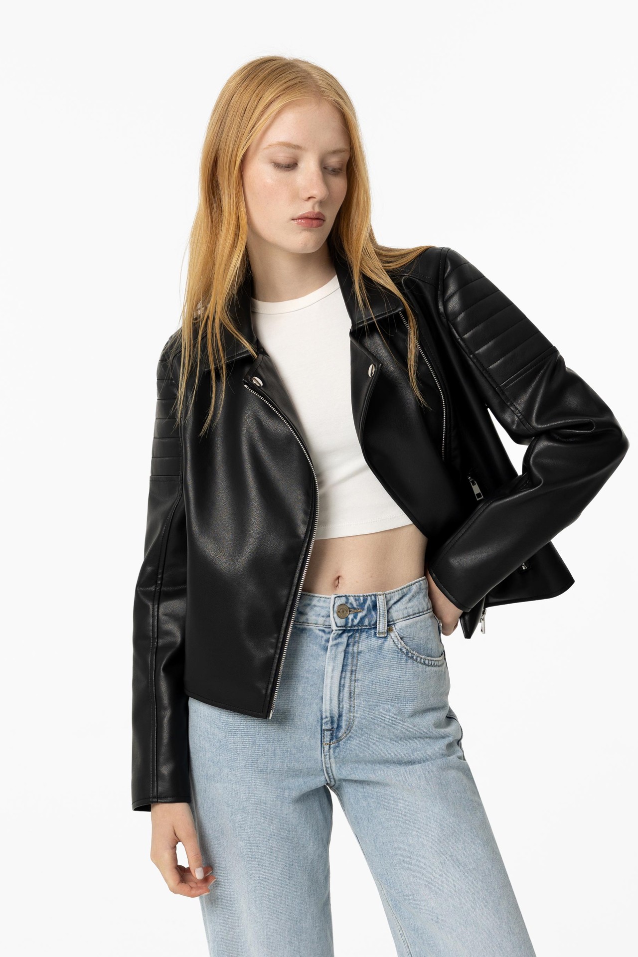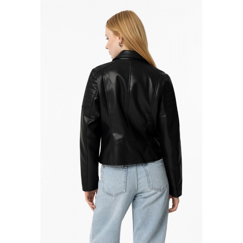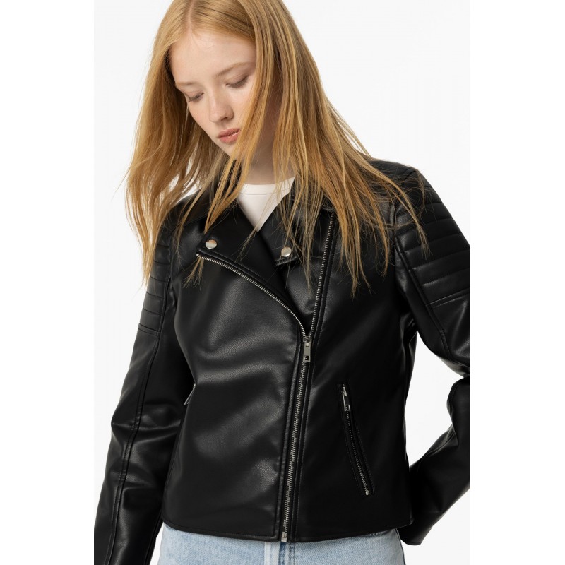 Cazadora efecto piel para mujer.De manga larga y cuello solapa. Bolsillos laterales. Cierre frontal cruzado con cremallera metálica.
