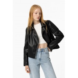 Cazadora efecto piel para mujer.De manga larga y cuello solapa. Bolsillos laterales. Cierre frontal cruzado con cremallera metálica.