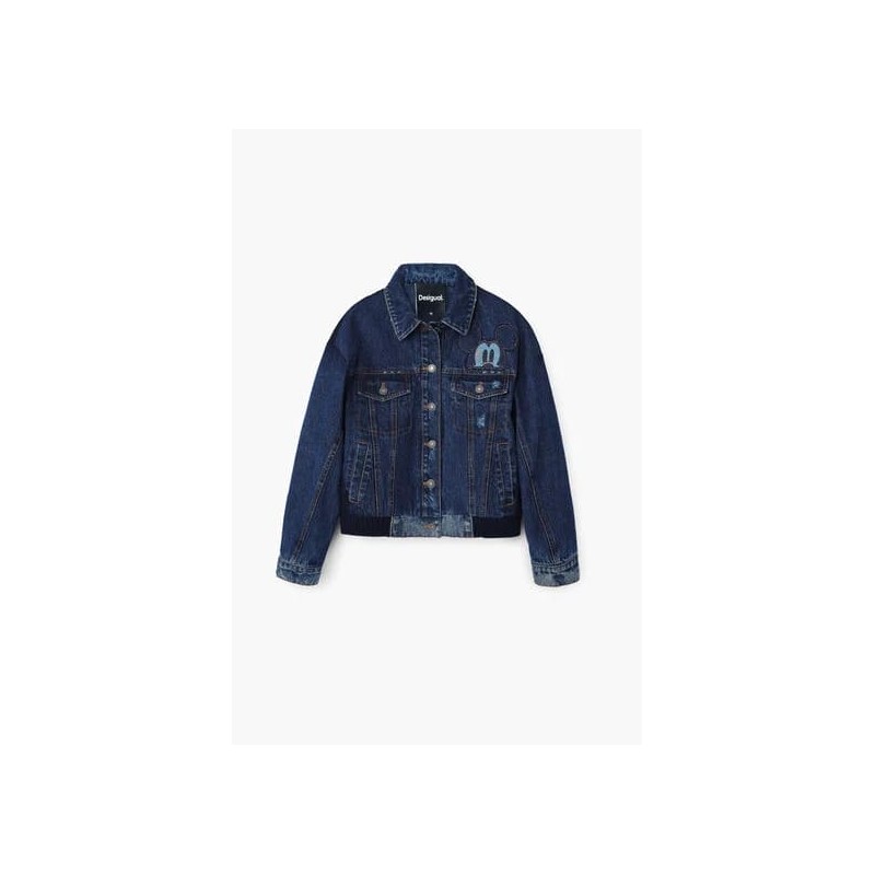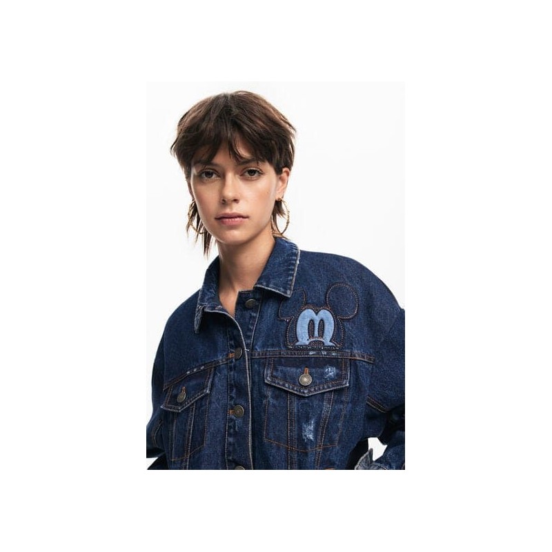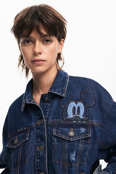 Cazadora denim para mujer de bordado de la cara de Mickey Mouse, cuello camisero, cierre frontal de botones y mangas largas.