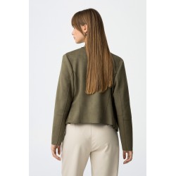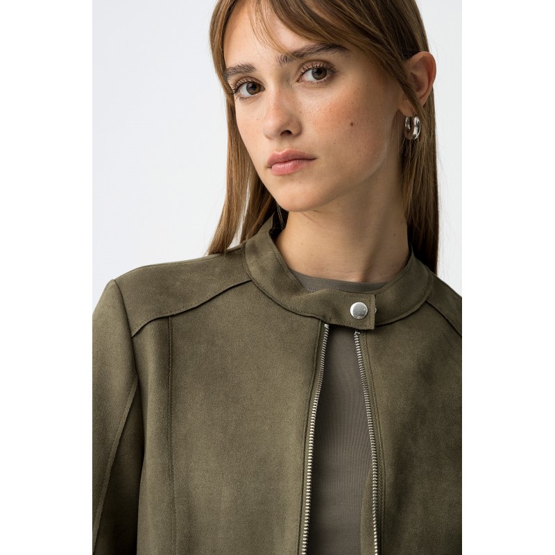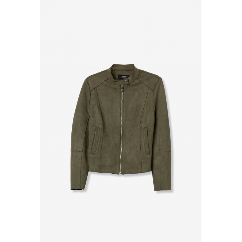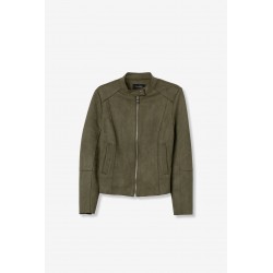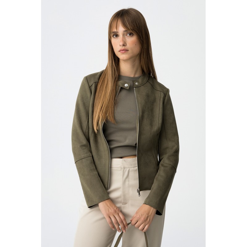 Chaqueta regular fit efecto ante para mujer. Con cierre de botón de presión en el cuello y dos bolsillos frontales. Apertura frontal con cremallera y manga larga.
